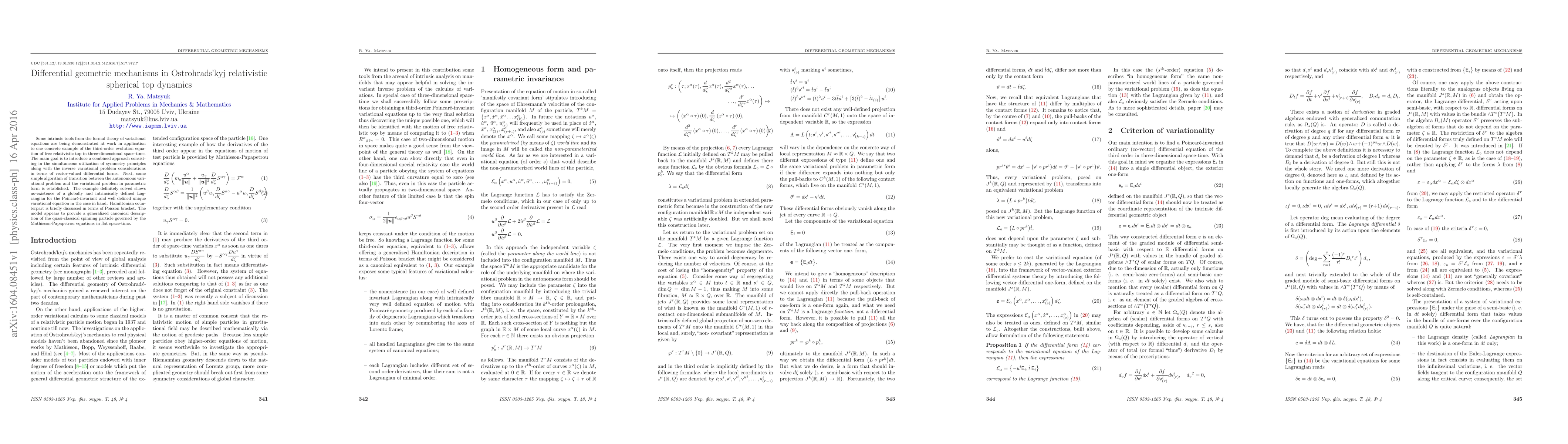 Some intrinsic tools from the formal theory of variational equations are being demonstrated at work in application to one concrete example of the third-order evolution equation of free relativistic top in three-dimensional space-time. The main goal is to introduce a combined approach consisting in the simultaneous utilization of symmetry principles along with the inverse variational problem considerations in terms of vector-valued differential forms. Next, some simple algorithm of transition between the autonomous variational problem and the variational problem in parametric form is established. The example definitely solved shows no-existence of a globally and intrinsically defined Lagrangian for the Poincar\'e-invariant and well defined unique variational equation in the case in hand. Hamiltonian counterpart is briefly discussed in terms of Poisson bracket. The model appears to provide a generalized canonical description of the quasi-classical spinning particle governed by the Mathisson-Papapetrou equations in flat space-time.