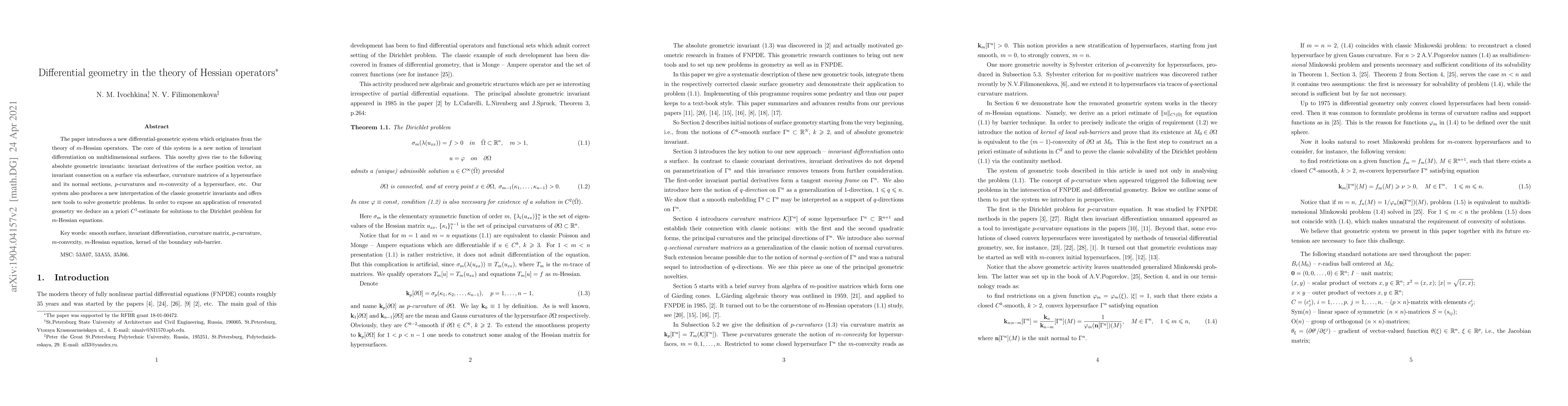 The paper introduces a new differential-geometric system which originates from the theory of $m$-Hessian operators. The core of this system is a new notion of invariant differentiation on multidimensional surfaces. This novelty gives rise to the following absolute geometric invariants: invariant derivatives of the surface position vector, an invariant connection on a surface via subsurface, curvature matrices of a hypersurface and its normal sections, $p$-curvatures and $m$-convexity of a hypersurface, etc. Our system also produces a new interpretation of the classic geometric invariants and offers new tools to solve geometric problems. In order to expose an application of renovated geometry we deduce an a priori $C^1$-estimate for solutions to the Dirichlet problem for $m$-Hessian equations.