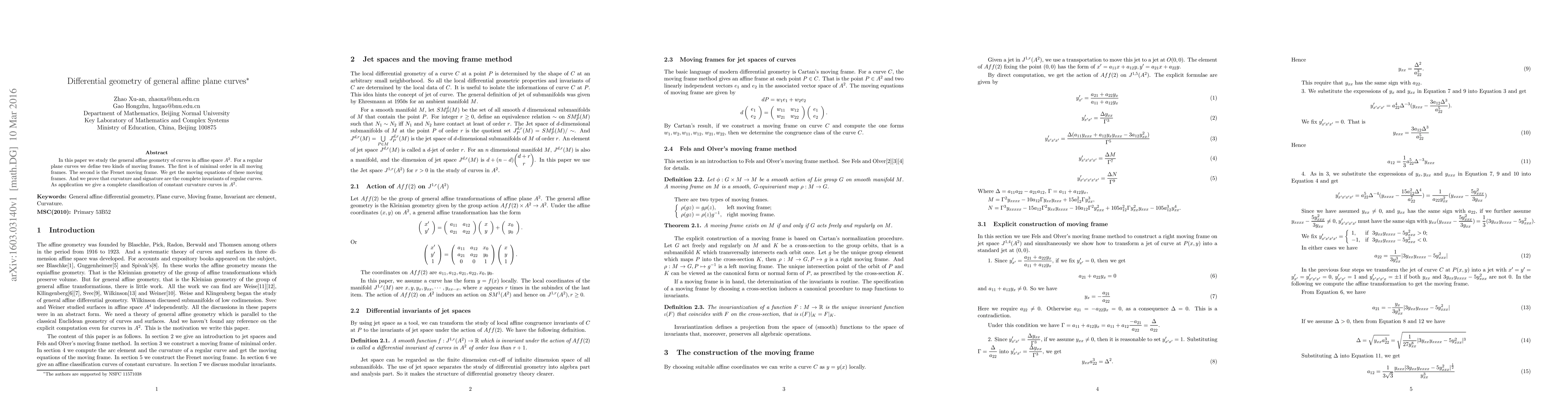 This paper explores the affine geometry of general plane curves in affine space $A^2$, defining minimal and Frenet moving frames and deriving their respective moving equations. It establishes curvature and signature as complete invariants and classifies constant curvature curves in $A^2$.