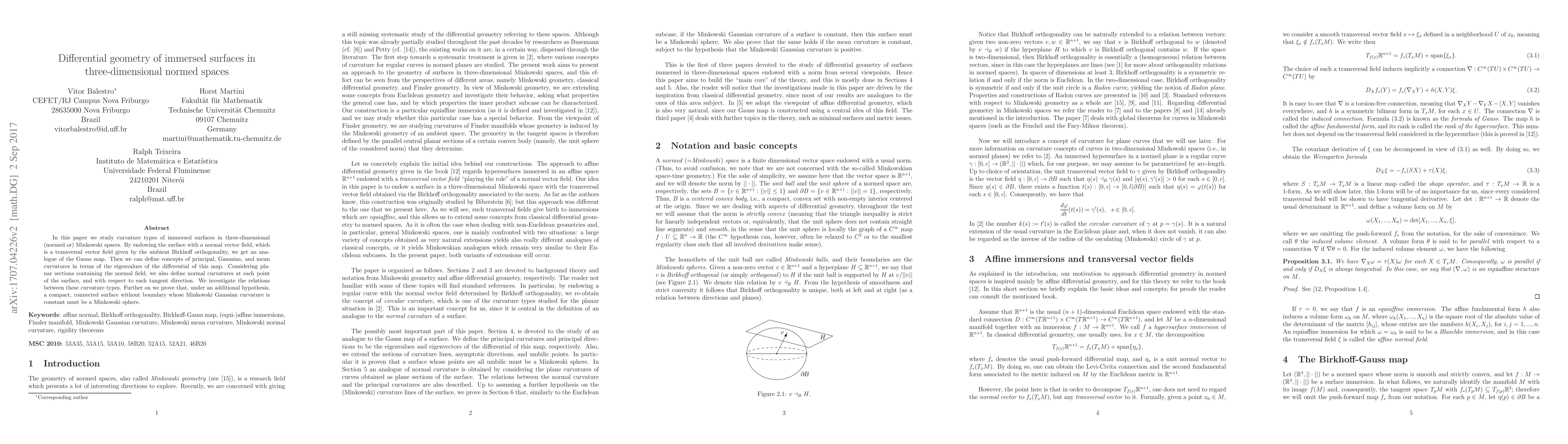 In this paper we study curvature types of immersed surfaces in three-dimensional (normed or) Minkowski spaces. By endowing the surface with a normal vector field, which is a transversal vector field given by the ambient Birkhoff orthogonality, we get an analogue of the Gauss map. Then we can define concepts of principal, Gaussian, and mean curvatures in terms of the eigenvalues of the differential of this map. Considering planar sections containing the normal field, we also define normal curvatures at each point of the surface, and with respect to each tangent direction. We investigate the relations between these curvature types. Further on we prove that, under an additional hypothesis, a compact, connected surface without boundary whose Minkowski Gaussian curvature is constant must be a Minkowski sphere.