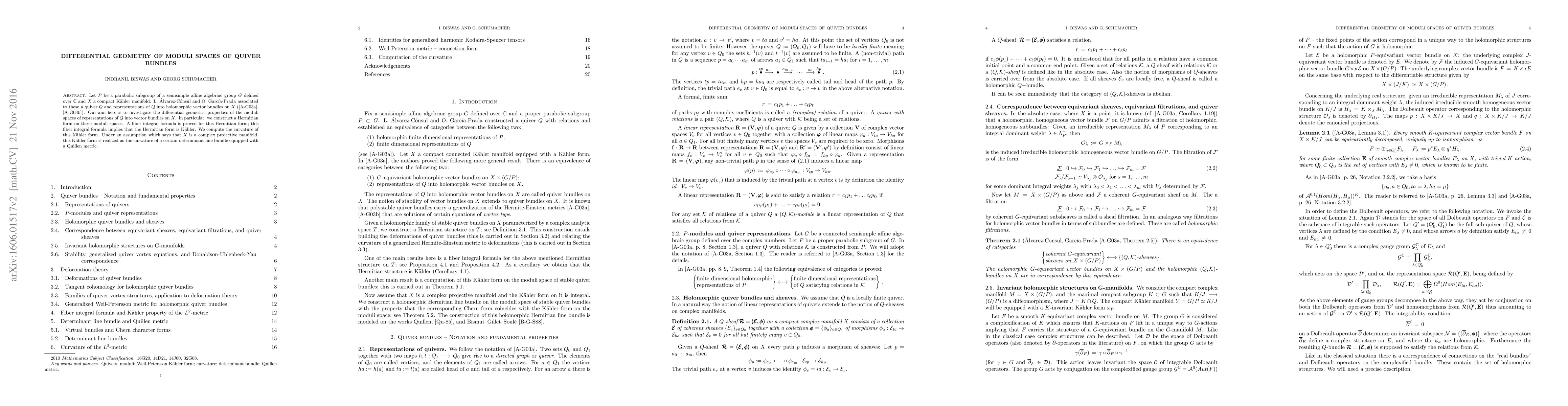 Let P be a parabolic subgroup of a simple affine algebraic group G defined over C and X a compact connected K\"ahler manifold. L. \'Alvarez-C\'onsul and O. Garc\'ia-Prada associated to these a quiver Q and representations of Q into holomorphic vector bundles on X. Our aim here is to investigate the differential geometric properties of the moduli spaces representations of Q into vector bundles on X. In particular, we construct a Hermitian form on these moduli spaces. A fiber integral formula is proved for this Hermitian form; this fiber integral formula implies that the Hermitian form is K\"ahler. We compute the curvature of this K\"ahler form. Under an assumption which says that X is a complex projective manifold, this K\"ahler form is realized as the curvature of a certain determinant line bundle equipped with a Quillen metric.