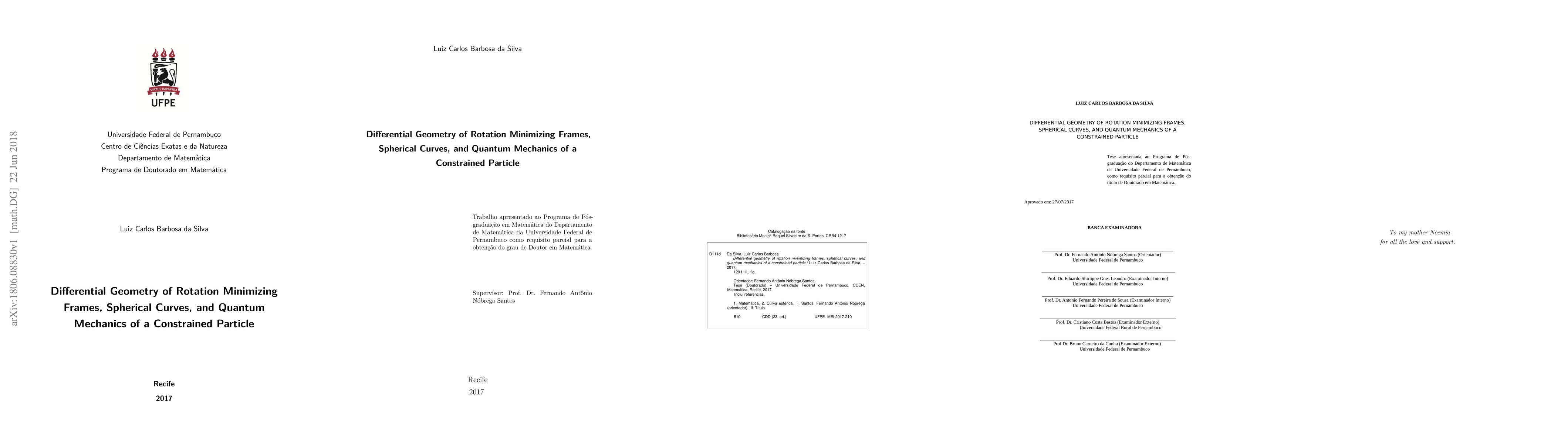 This paper explores the differential geometry of rotation minimizing frames and spherical curves, applying these concepts to quantum mechanics. It introduces the Frenet frame and defines rotation minimizing frames, which are used to characterize spherical curves through linear equations. The study extends to level surfaces in non-Euclidean spaces, leading to the construction of RM frames in $\mathbb{E}_1^3$ and $\mathbb{I}^3$. The second part applies these geometric tools to quantum dynamics, showing how RM frames simplify the description of constrained particles and reveal geometric phase effects in tubular surfaces.
