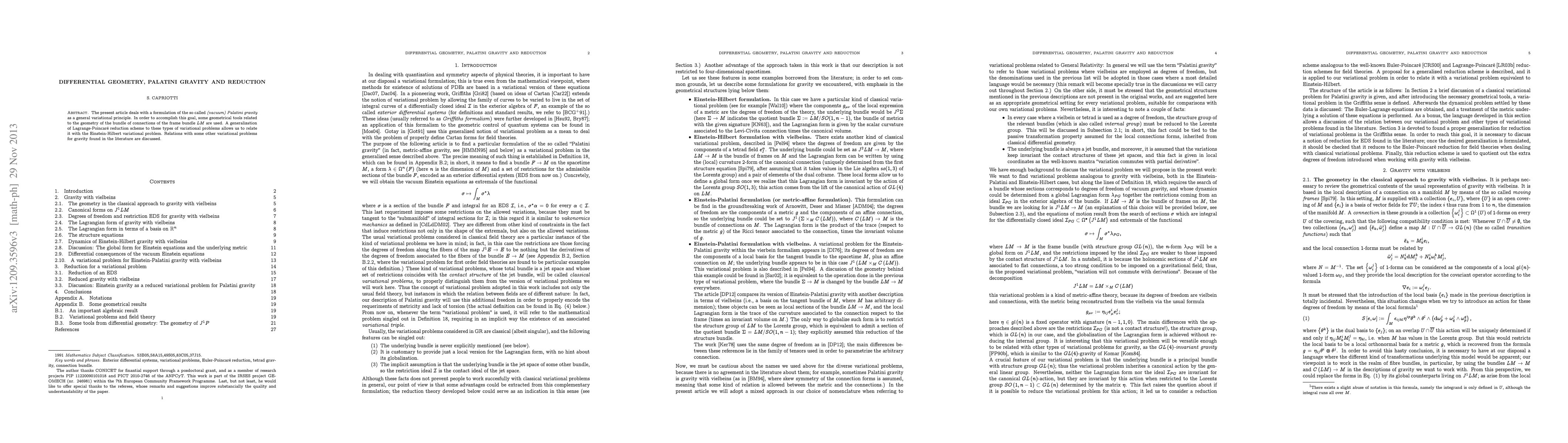 This paper formulates vacuum Palatini gravity as a variational principle using geometric tools from the bundle of connections of the frame bundle $LM$. It generalizes the Lagrange-Poincaré reduction scheme to relate this formulation to the Einstein-Hilbert action, and discusses connections to other gravity variational problems.