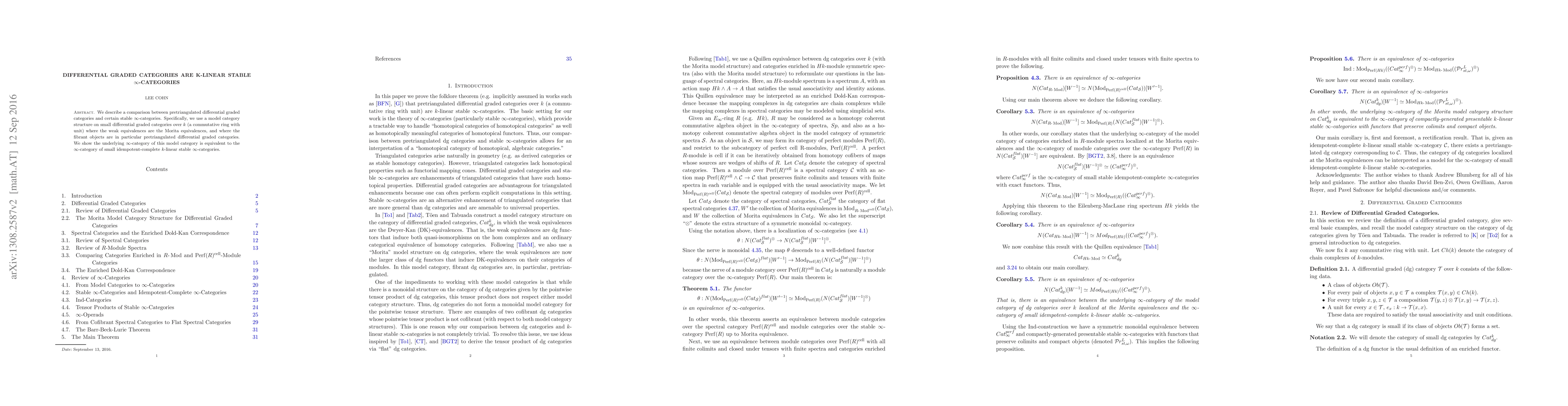 This paper compares pretriangulated differential graded categories with k-linear stable infinity categories, establishing an equivalence between their underlying infinity categories through a model category structure on differential graded categories over a field k of characteristic 0.