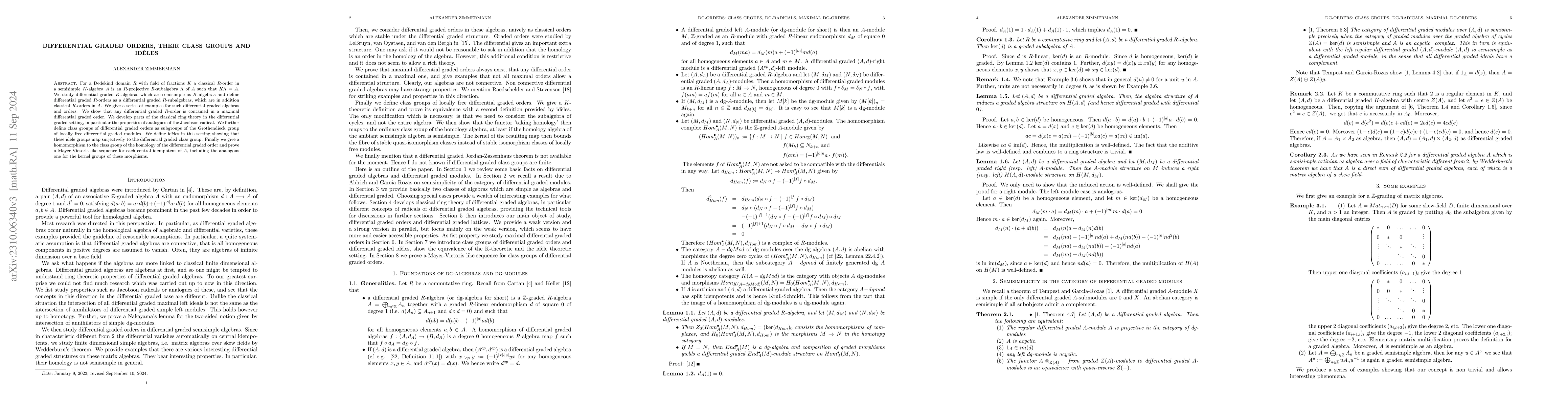 This paper explores differential graded $R$-orders in semisimple $K$-algebras for a Dedekind domain $R$, defines their maximal orders, and develops ring theory concepts in this setting. It introduces class groups and idèles for these orders, showing isomorphisms and establishing a Mayer-Vietoris sequence related to their homology.