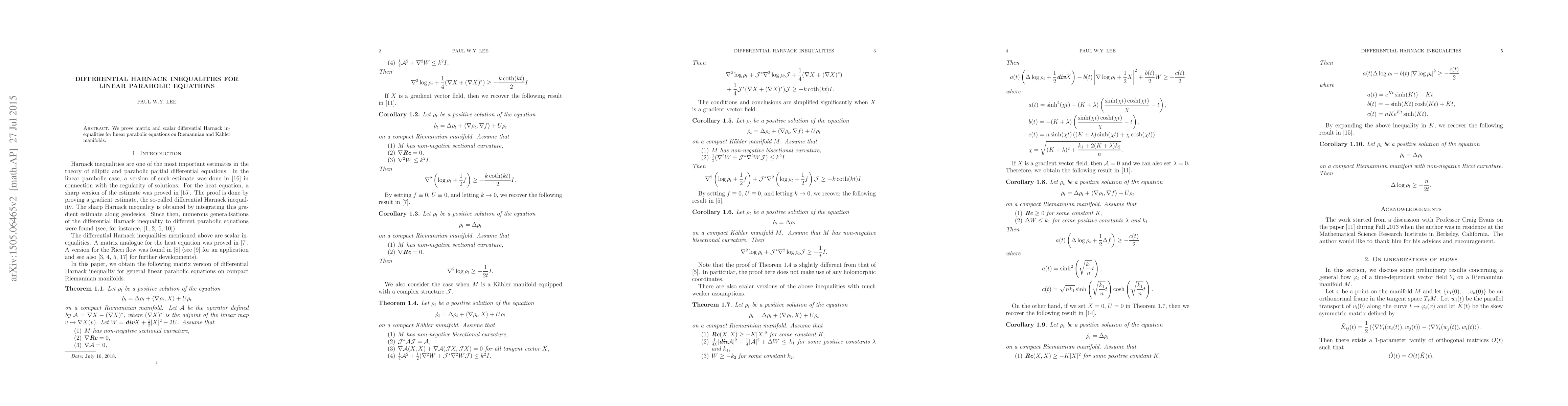 Summary: This paper establishes matrix and scalar differential Harnack inequalities for linear parabolic equations on Riemannian and Kähler manifolds, providing crucial tools for understanding the behavior of solutions to these equations.