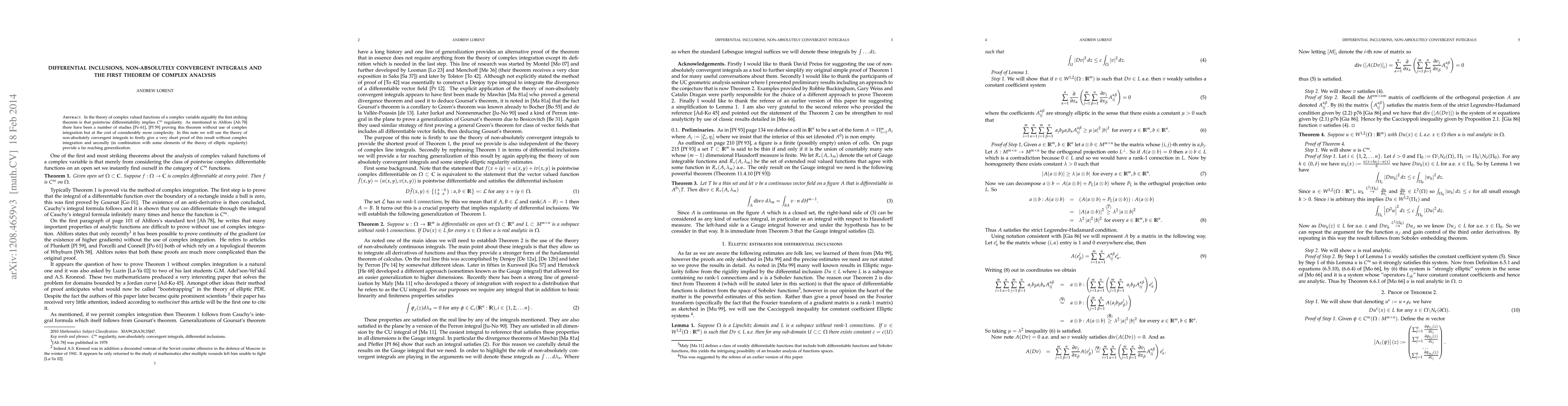 In the theory of complex valued functions of a complex variable arguably the first striking theorem is that pointwise differentiability implies $C^{\infty}$ regularity. As mentioned in Ahlfors's standard textbook there have been a number of studies proving this theorem without use of complex integration but at the cost of considerably more complexity. In this note we will use the theory of non-absolutely convergent integrals to firstly give a very short proof of this result without complex integration and secondly (in combination with some elements of the theory of elliptic regularity) provide a far reaching generalization.