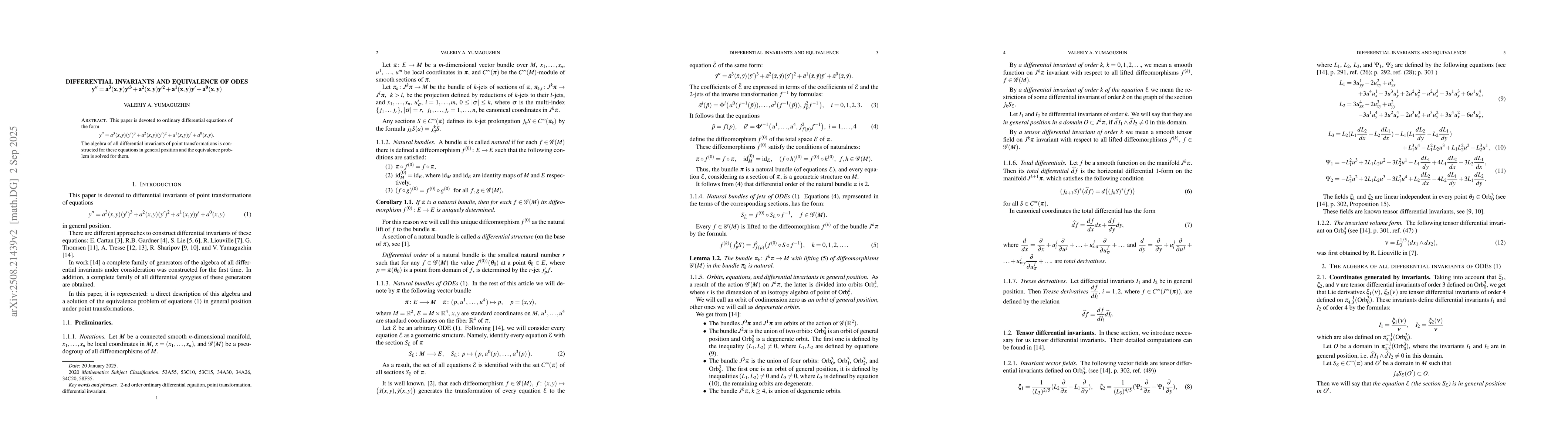This paper is devoted to ordinary differential equations of the form $$y''=a^3(x,y)y'^3+a^2(x,y)y'^2+a^1(x,y)y'+a^0(x,y)$$ The algebra of all differential invariants of point transformations is constructed for these equations in general position and the equivalence problem is solved for them.