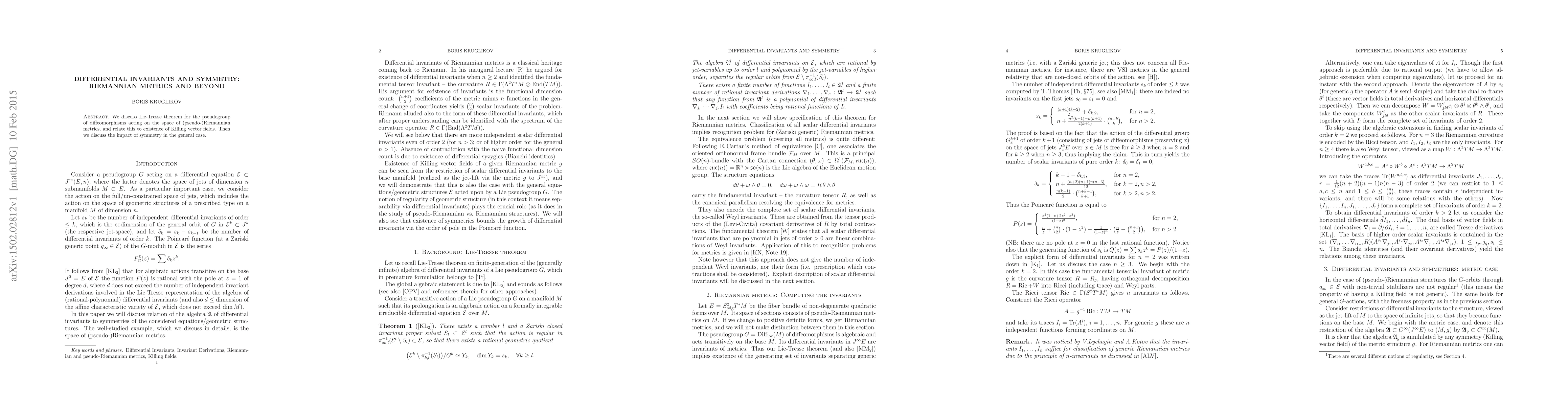 We discuss Lie-Tresse theorem for the pseudogroup of diffeomorphisms acting on the space of (pseudo-)Riemannian metrics, and relate this to existence of Killing vector fields. Then we discuss the impact of symmetry in the general case.