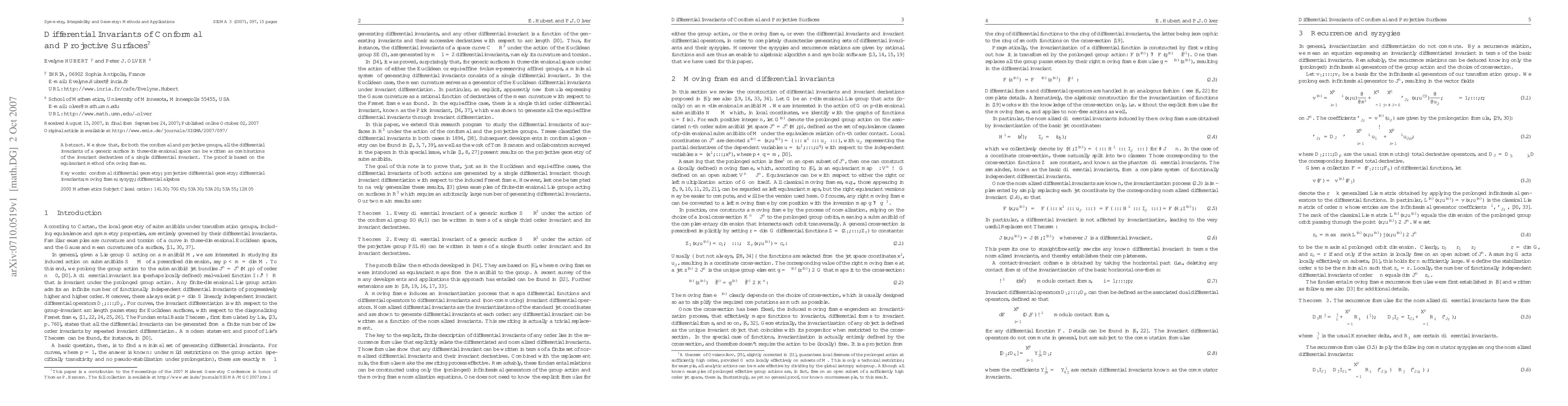 This paper demonstrates that differential invariants for both conformal and projective transformations of generic surfaces in three-dimensional space can be expressed as combinations of invariant derivatives of a single differential invariant, using the equivariant method of moving frames for proof.