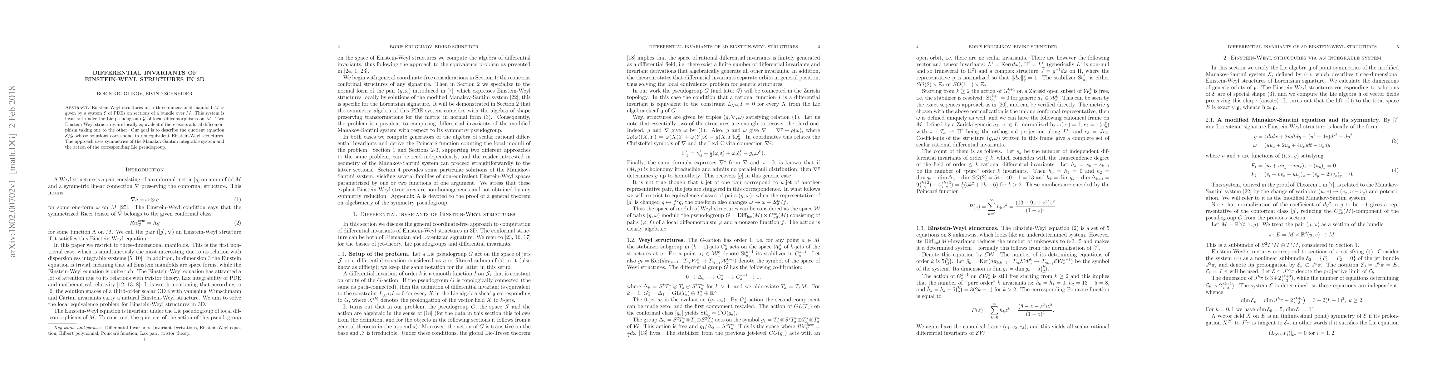This paper explores the differential invariants of Einstein-Weyl structures in three-dimensional manifolds, focusing on the quotient of the system of equations $E$ by the Lie pseudogroup $G$ of local diffeomorphisms. It utilizes symmetries from the Manakov-Santini integrable system to describe nonequivalent Einstein-Weyl structures.
