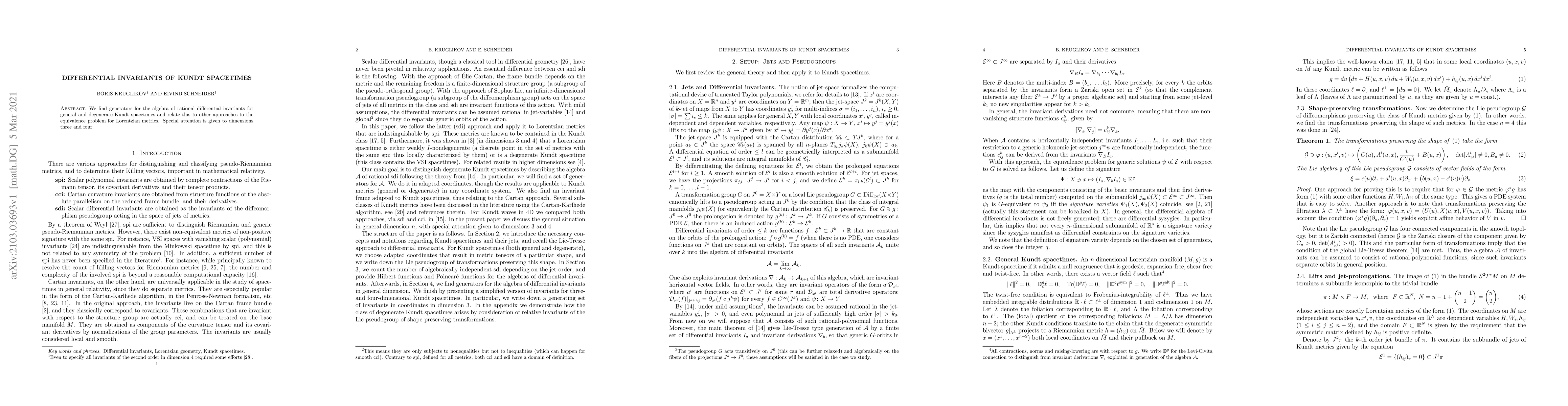 This paper identifies generators for the algebra of rational differential invariants in Kundt spacetimes, focusing on dimensions three and four, and connects these findings to the broader equivalence problem for Lorentzian metrics. The study highlights the significance of these invariants in classifying and understanding the structure of Kundt spacetimes.