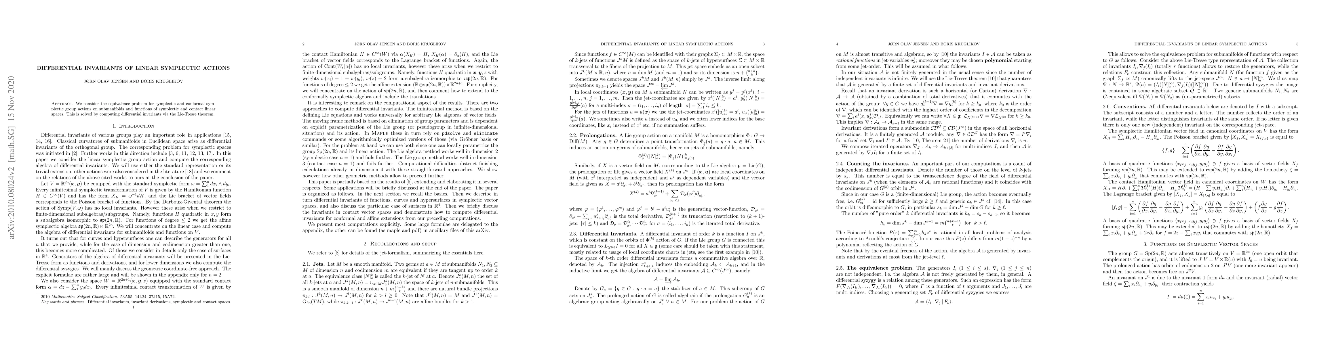 Summary: This paper addresses the equivalence problem for symplectic and conformal symplectic group actions on submanifolds and functions within symplectic and contact linear spaces, utilizing the Lie-Tresse theorem to compute differential invariants.