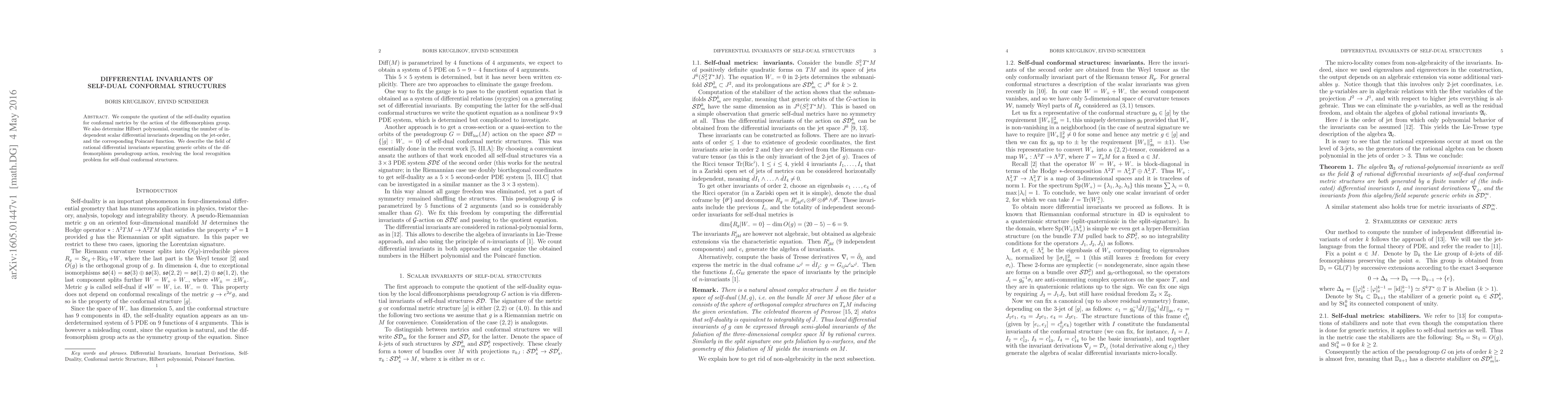 This paper computes the differential invariants of self-dual conformal structures by analyzing the quotient of the self-duality equation under diffeomorphisms, and determines the Hilbert polynomial and Poincaré function for these invariants. It resolves the local recognition problem for these structures by describing the field of rational differential invariants.