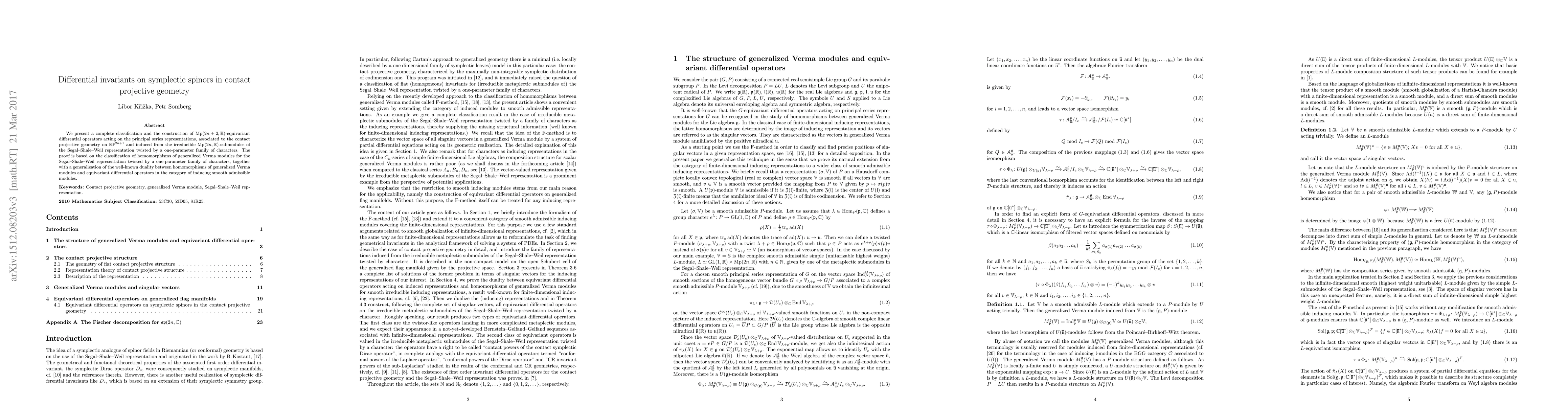 We present a complete classification and the construction of $\mathrm{Mp}(2n+2,\mathbb{R})$-equivariant differential operators acting on the principal series representations, associated to the contact projective geometry on $\mathbb{RP}^{2n+1}$ and induced from the irreducible $\mathrm{Mp}(2n,\mathbb{R})$-submodules of the Segal-Shale-Weil representation twisted by a one-parameter family of characters. The proof is based on the classification of homomorphisms of generalized Verma modules for the Segal-Shale-Weil representation twisted by a one-parameter family of characters, together with a generalization of the well-known duality between homomorphisms of generalized Verma modules and equivariant differential operators in the category of inducing smooth admissible modules.