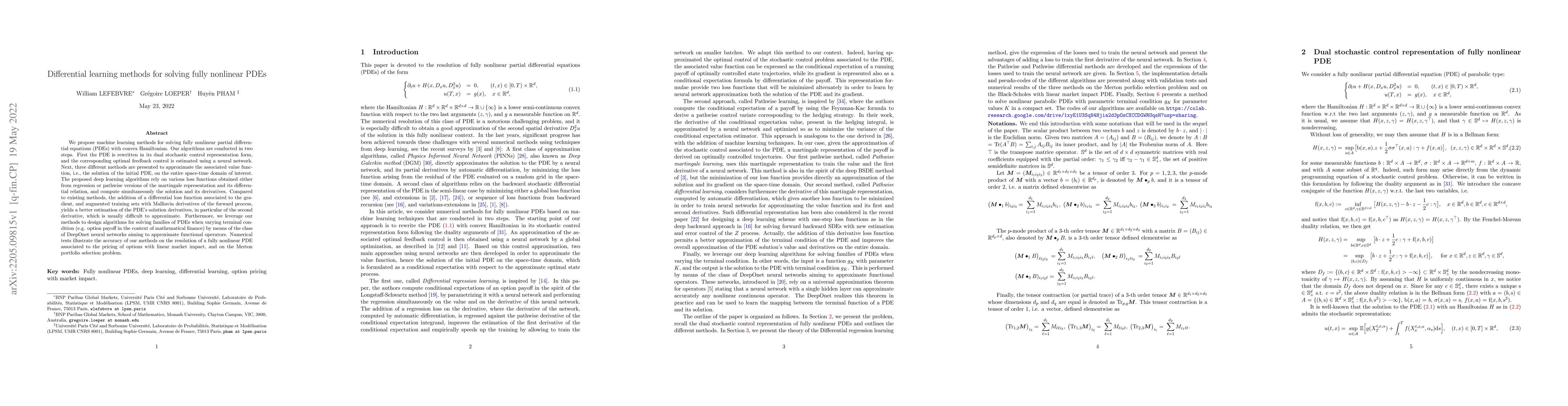 This paper proposes machine learning techniques to solve fully nonlinear PDEs using neural networks, transforming the PDE into a dual stochastic control form and estimating the optimal feedback control. It introduces three methods to approximate the value function, emphasizing the use of differential loss functions for better derivative estimation, particularly the second derivative. The approach is validated through numerical tests on option pricing and portfolio selection problems.