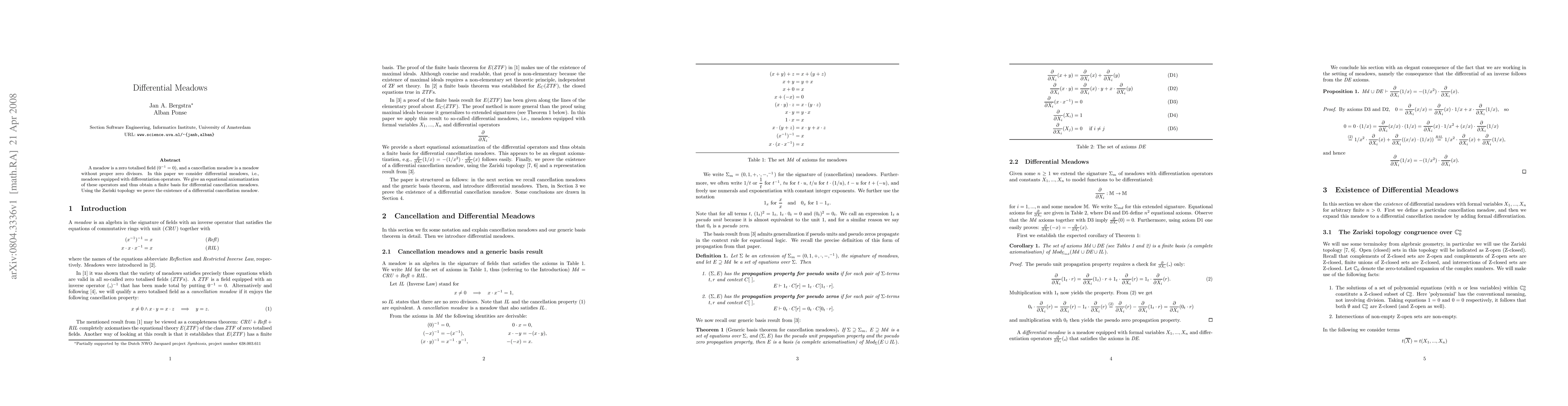 This paper explores the concept of differential meadows, which are meadows equipped with differentiation operators, and provides an equational axiomatization for these operators. It establishes a finite basis for differential cancellation meadows and uses the Zariski topology to demonstrate the existence of such structures.