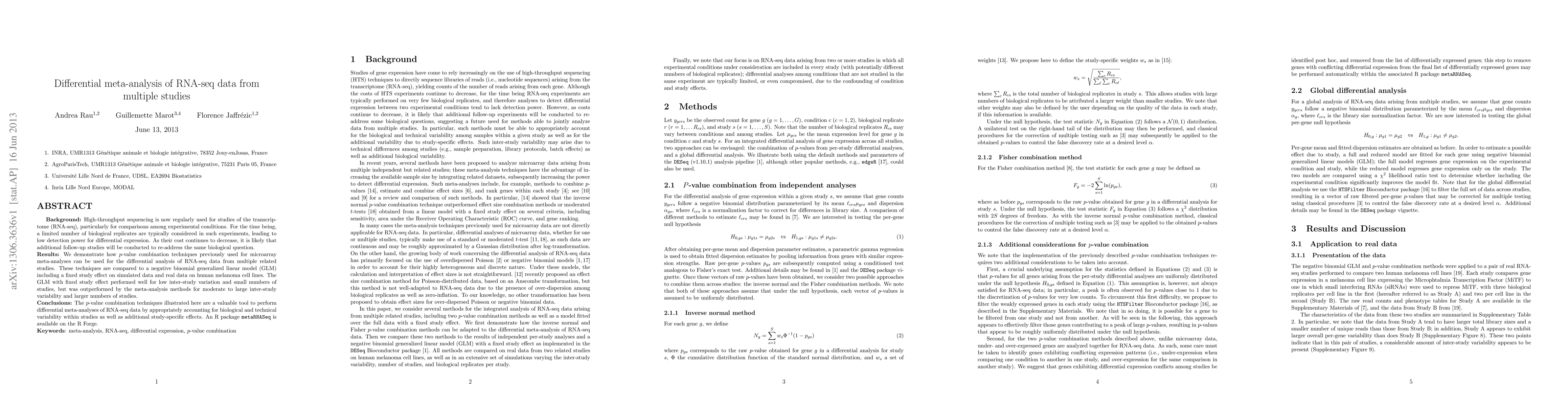 This paper demonstrates the application of p-value combination techniques for differential meta-analysis of RNA-seq data from multiple studies, showing they outperform a negative binomial GLM under moderate to large inter-study variability and larger study numbers. An R package, metaRNASeq, is provided for this purpose.