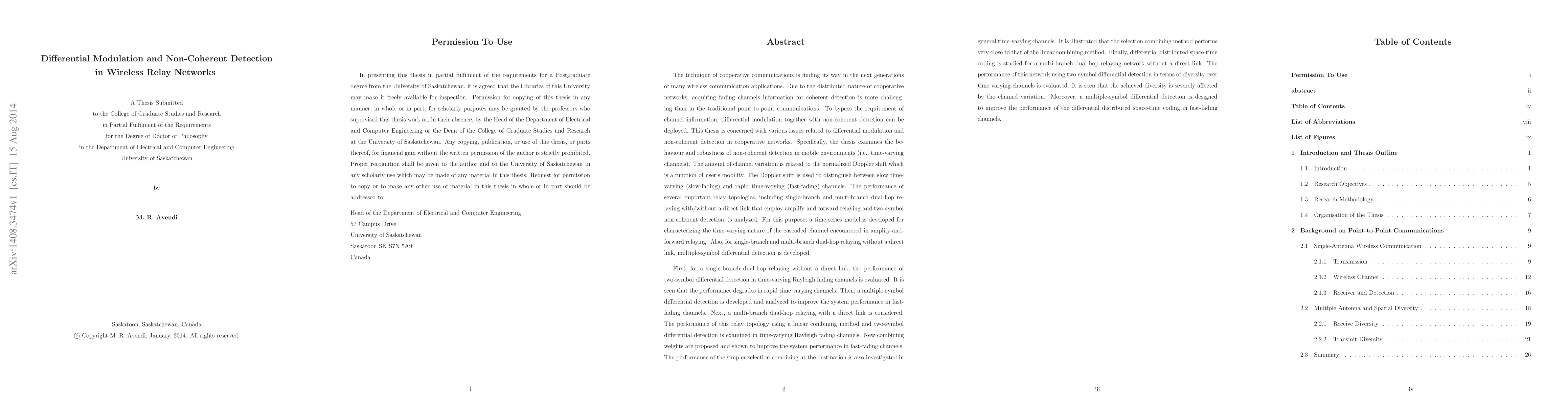This paper investigates differential modulation and non-coherent detection techniques in cooperative wireless relay networks, focusing on their performance in mobile environments with time-varying channels. It analyzes various relay topologies under different fading conditions and develops a time-series model to characterize the cascaded channels in amplify-and-forward relaying.
