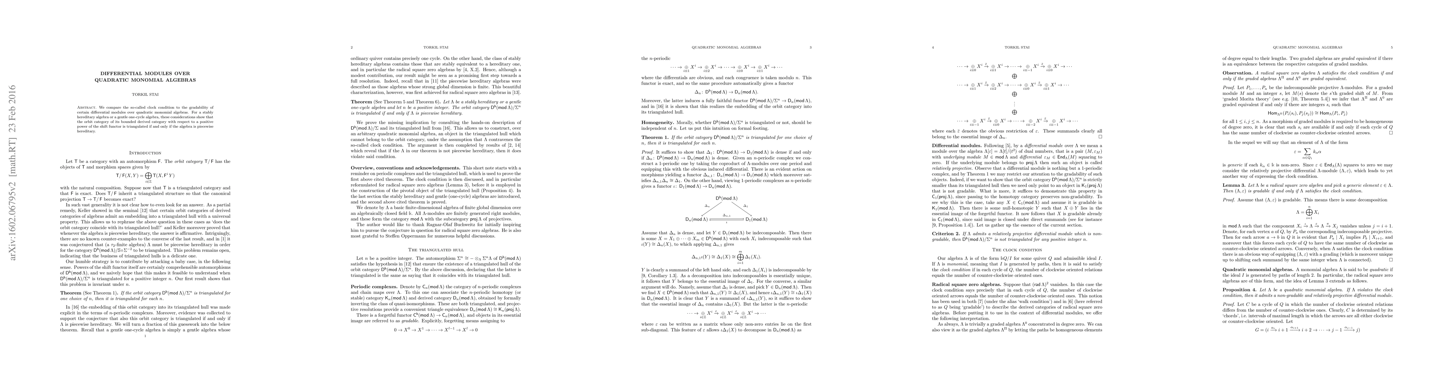 This paper explores the relationship between the clock condition and the gradability of differential modules over quadratic monomial algebras, demonstrating that for stably hereditary or gentle one-cycle algebras, the triangulated orbit category of its derived category corresponds to the algebra being piecewise hereditary.