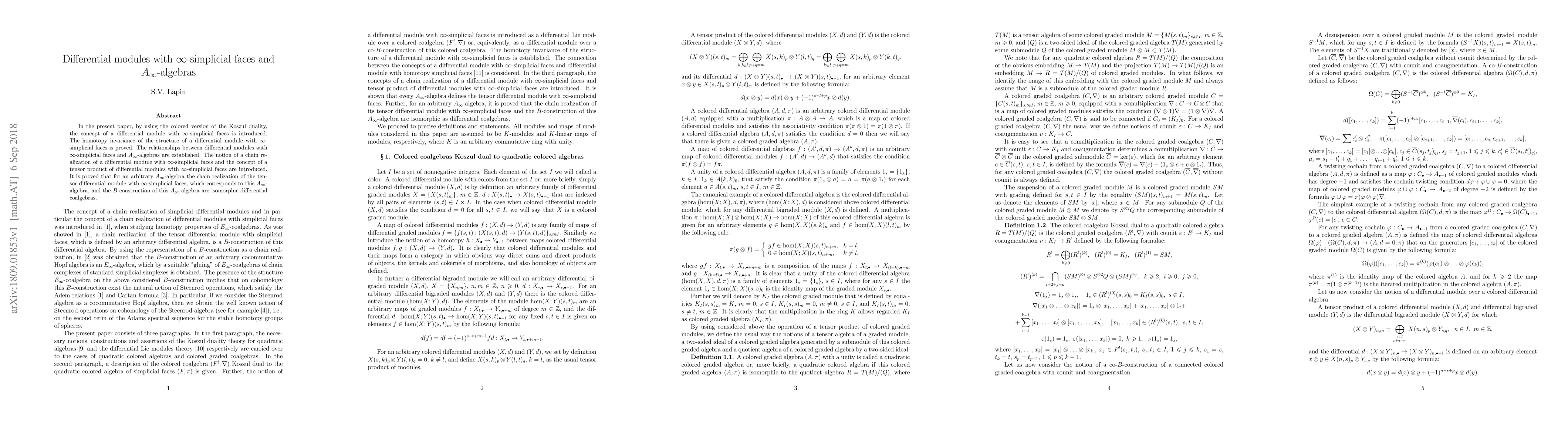 This paper introduces differential modules with $\infty$-simplicial faces and proves their homotopy invariance using colored Koszul duality. It establishes connections between these modules and $A_\infty$-algebras, introducing chain realizations and tensor products, and shows isomorphism between the tensor differential module's chain realization and the $B$-construction of an $A_\infty$-algebra.