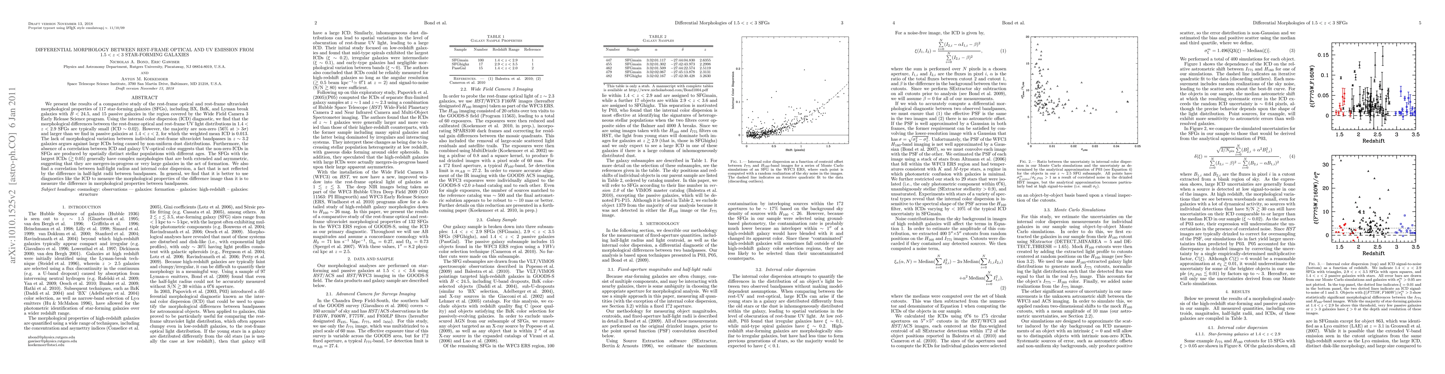 This study compares the morphological properties of star-forming galaxies at 1.5 < z < 3 in rest-frame optical and UV, finding small but significant differences typically with an internal color dispersion (ICD) of ~0.02. Larger ICDs suggest complex, asymmetric morphologies indicative of mergers or large-scale formations.