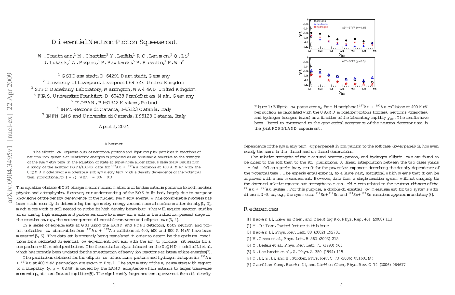 The elliptic flow (squeeze-out) of neutrons, protons and light complex particles in reactions of neutron-rich systems at relativistic energies is proposed as an observable sensitive to the strength of the symmetry term in the equation of state at supra-normal densities. Preliminary results from a study of the existing FOPI/LAND data for 197Au + 197Au collisions at 400 A MeV with the UrQMD model favor a moderately soft symmetry term with a density dependence of the potential term proportional to (rho/rho_0)^gamma with gamma = 0.6+-0.3.