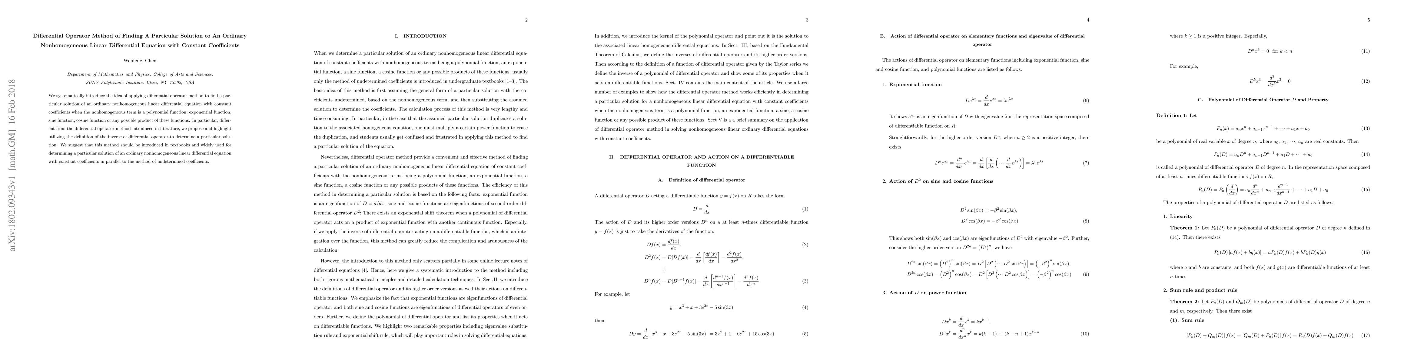 This paper introduces a differential operator method for finding particular solutions to nonhomogeneous linear differential equations with constant coefficients, using the inverse differential operator definition. It proposes this method as an alternative to the traditional method of undetermined coefficients for handling polynomial, exponential, and trigonometric nonhomogeneous terms.