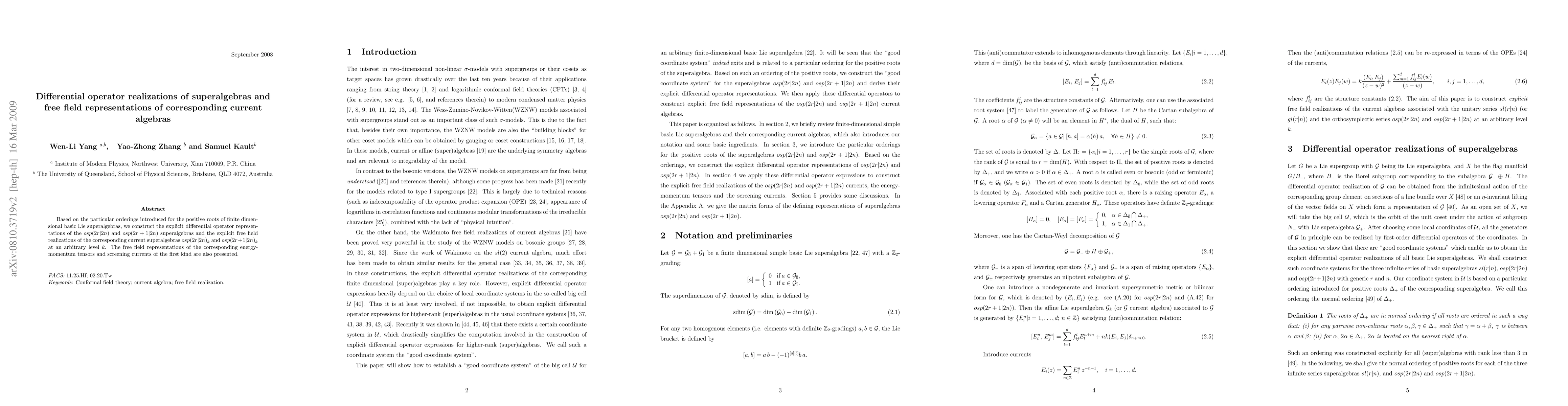 This paper constructs explicit differential operator representations for the $osp(2r|2n)$ and $osp(2r+1|2n)$ superalgebras and provides free field realizations for their corresponding current algebras $osp(2r|2n)_k$ and $osp(2r+1|2n)_k$ at any level $k$, along with representations of their energy-momentum tensors and screening currents.
