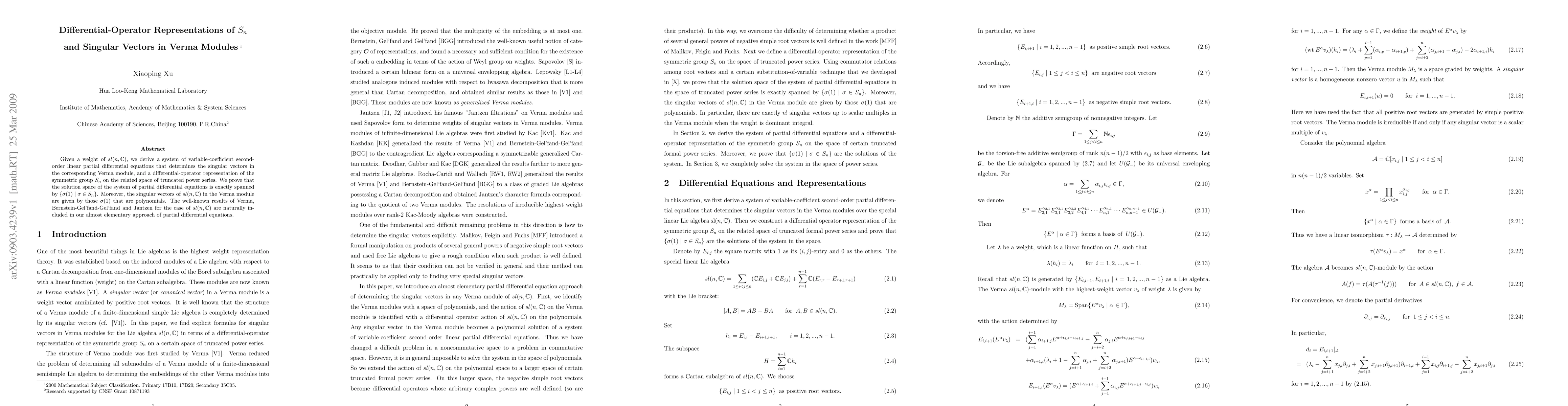 Given a weight of $sl(n,\mbb{C})$, we derive a system of variable-coefficient second-order linear partial differential equations that determines the singular vectors in the corresponding Verma module, and a differential-operator representation of the symmetric group $S_n$ on the related space of truncated power series. We prove that the solution space of the system of partial differential equations is exactly spanned by $\{\sgm(1)\mid \sgm\in S_n\}$. Moreover, the singular vectors of $sl(n,\mbb{C})$ in the Verma module are given by those $\sgm(1)$ that are polynomials. The well-known results of Verma, Bernstein-Gel'fand-Gel'fand and Jantzen for the case of $sl(n,\mbb{C})$ are naturally included in our almost elementary approach of partial differential equations.