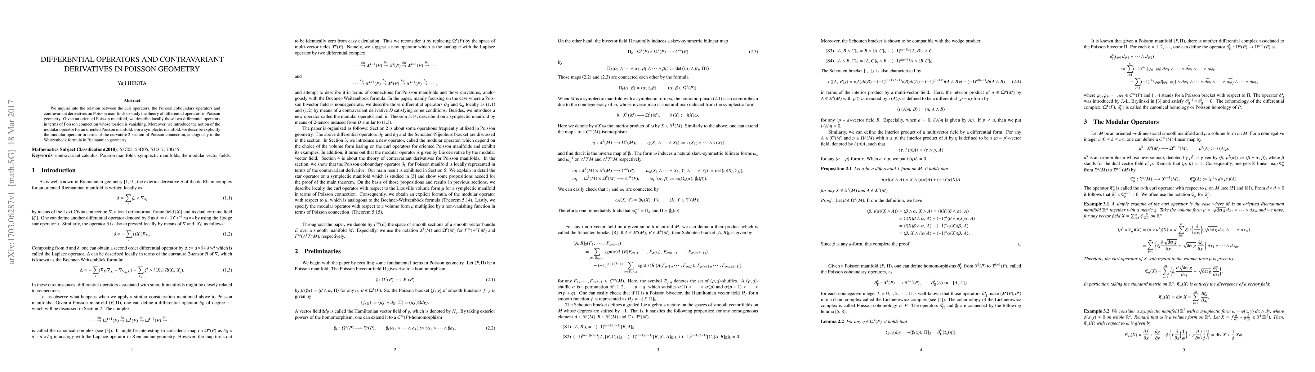 We inquire into the relation between the curl operators, the Poisson coboundary operators and contravariant derivatives on Poisson manifolds to study the theory of differential operators in Poisson geometry. Given an oriented Poisson manifold, we describe locally those two differential operators in terms of Poisson connection whose torsion is vanishing. Moreover, we introduce the notion of the modular operator for an oriented Poisson manifold. For a symplectic manifold, we describe explicitly the modular operator in terms of the curvature 2-section of Poisson connection, analogously to the Weitzenb$\ddot{\rm o}$ck formula in Riemannian geometry.