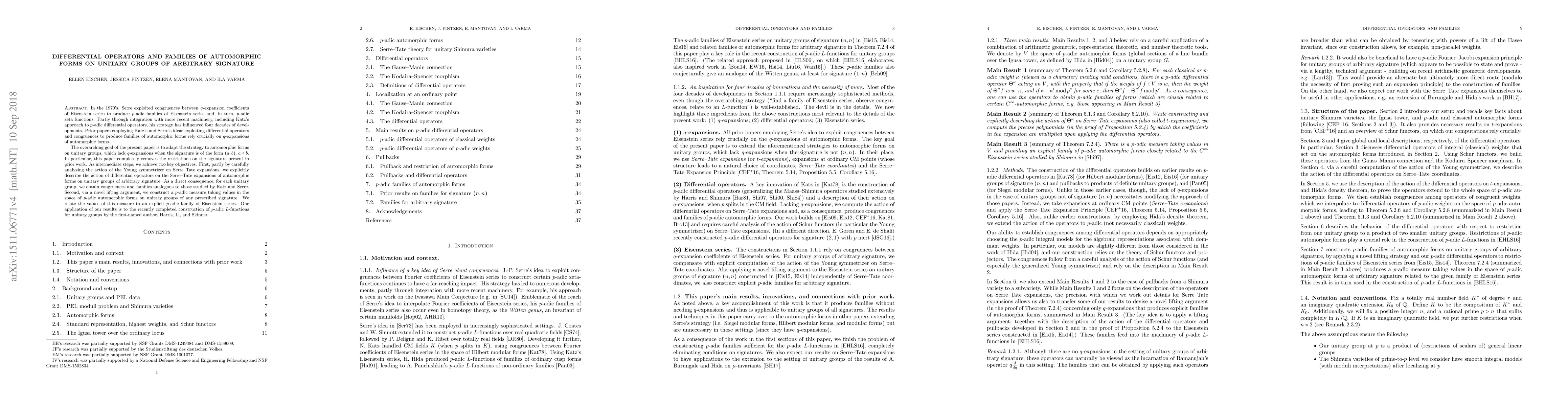 In the 1970's, Serre exploited congruences between $q$-expansion coefficients of Eisenstein series to produce $p$-adic families of Eisenstein series and, in turn, $p$-adic zeta functions. Partly through integration with more recent machinery, including Katz's approach to $p$-adic differential operators, his strategy has influenced four decades of developments. Prior papers employing Katz's and Serre's ideas exploiting differential operators and congruences to produce families of automorphic forms rely crucially on $q$-expansions of automorphic forms. The overarching goal of the present paper is to adapt the strategy to automorphic forms on unitary groups, which lack $q$-expansions when the signature is of the form $(a, b)$, $a\neq b$. In particular, this paper completely removes the restrictions on the signature present in prior work. As intermediate steps, we achieve two key objectives. First, partly by carefully analyzing the action of the Young symmetrizer on Serre-Tate expansions, we explicitly describe the action of differential operators on the Serre-Tate expansions of automorphic forms on unitary groups of arbitrary signature. As a direct consequence, for each unitary group, we obtain congruences and families analogous to those studied by Katz and Serre. Second, via a novel lifting argument, we construct a $p$-adic measure taking values in the space of $p$-adic automorphic forms on unitary groups of any prescribed signature. We relate the values of this measure to an explicit $p$-adic family of Eisenstein series. One application of our results is to the recently completed construction of $p$-adic $L$-functions for unitary groups by the first named author, Harris, Li, and Skinner.