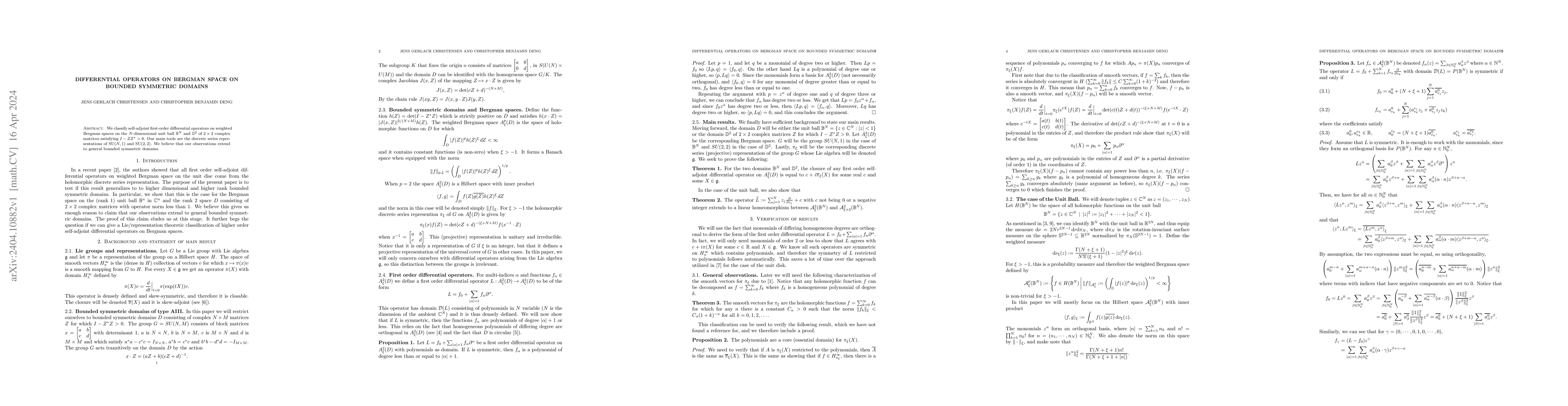 This paper classifies self-adjoint first-order differential operators on weighted Bergman spaces over the unit ball and complex matrix domains, utilizing discrete series representations from $\mathrm{SU}(N,1)$ and $\mathrm{SU}(2,2)$. The findings are expected to generalize to broader bounded symmetric domains.