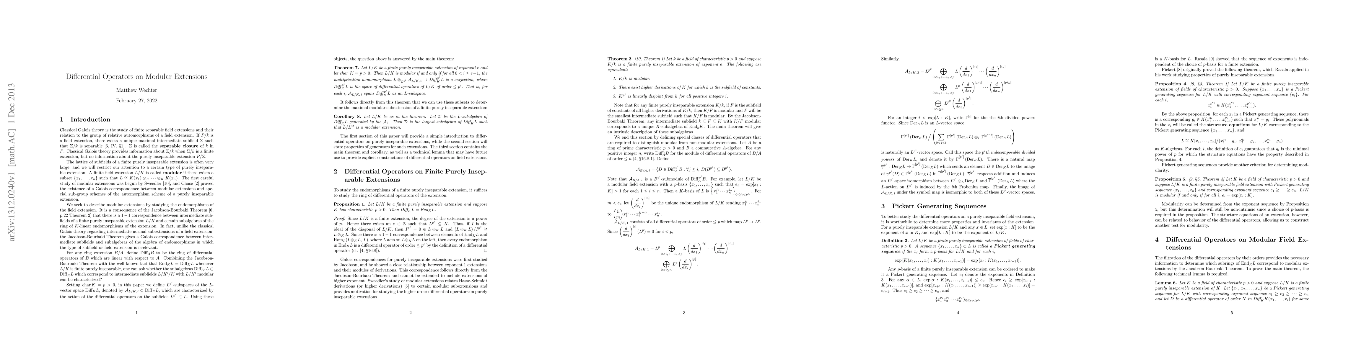 We determine necessary and sufficient conditions on the ring of differential operators of a finite purely inseparable field extension of positive characteristic for determining whether the extension is modular.
