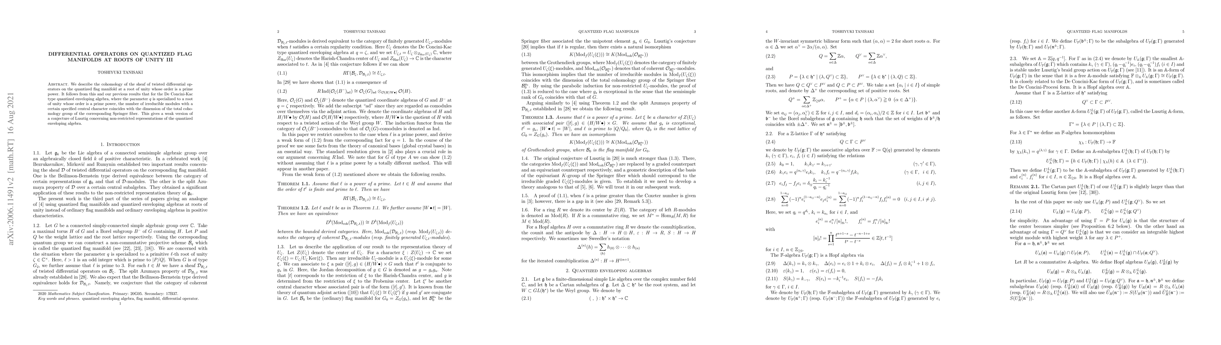 This paper studies the cohomology of twisted differential operators on quantized flag manifolds at roots of unity, revealing that the number of irreducible modules for a De Concini-Kac type quantized algebra matches the dimension of the Springer fiber's total cohomology, supporting a conjecture by Lusztig on non-restricted representations.