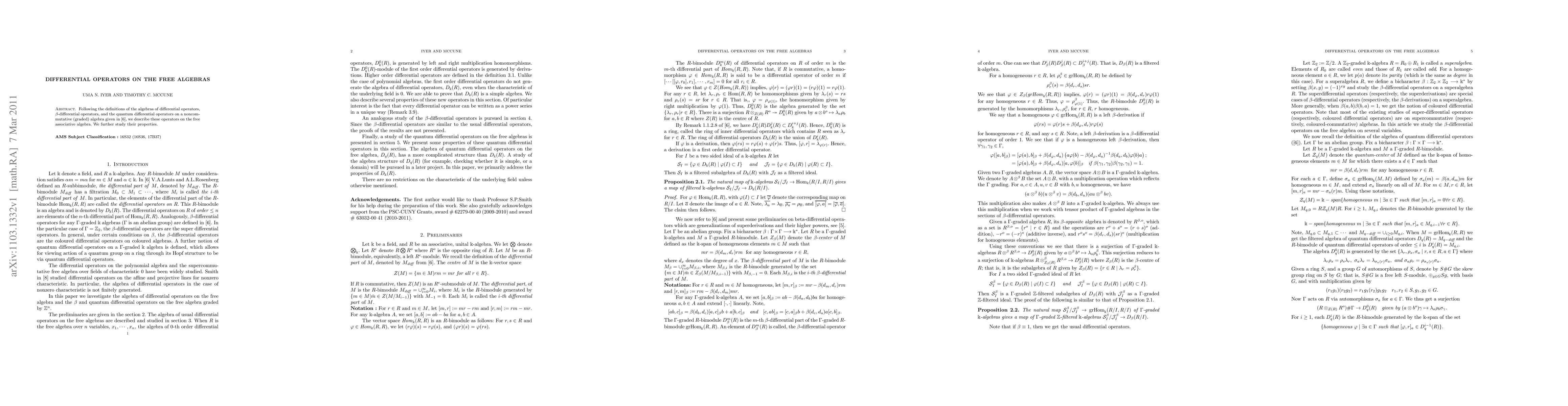 This paper explores the definitions and properties of differential, $\beta$-differential, and quantum differential operators on the free associative algebra, extending previous work on noncommutative (graded) algebras. It investigates the characteristics and behaviors of these operators within the free algebra framework.