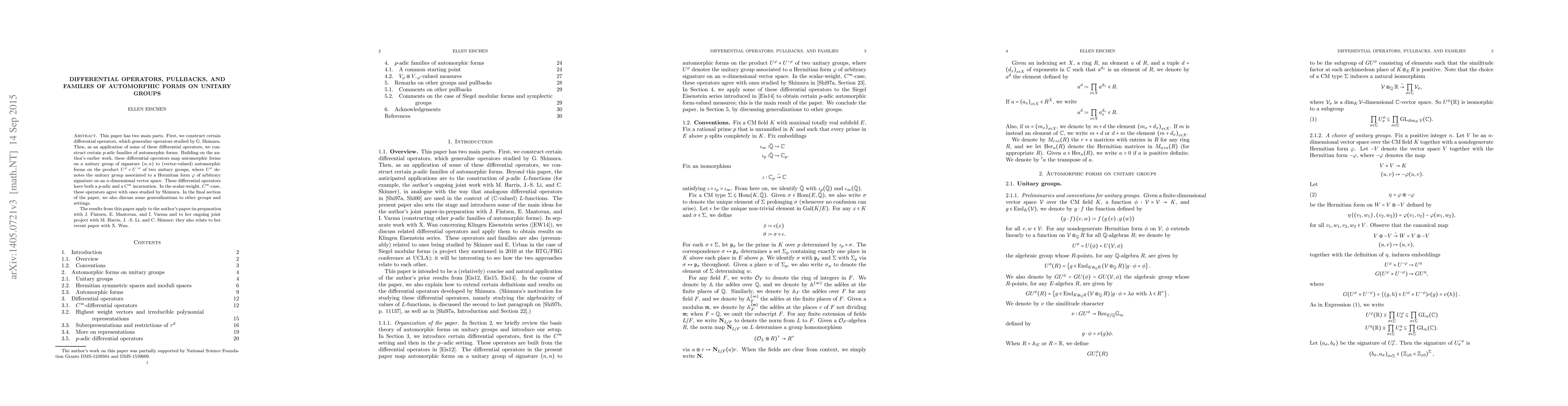 This paper constructs generalized differential operators by Shimura, applying them to create p-adic families of automorphic forms for unitary groups. The operators map forms between different unitary groups and have both p-adic and C-infinity versions, with connections to ongoing and future research projects.