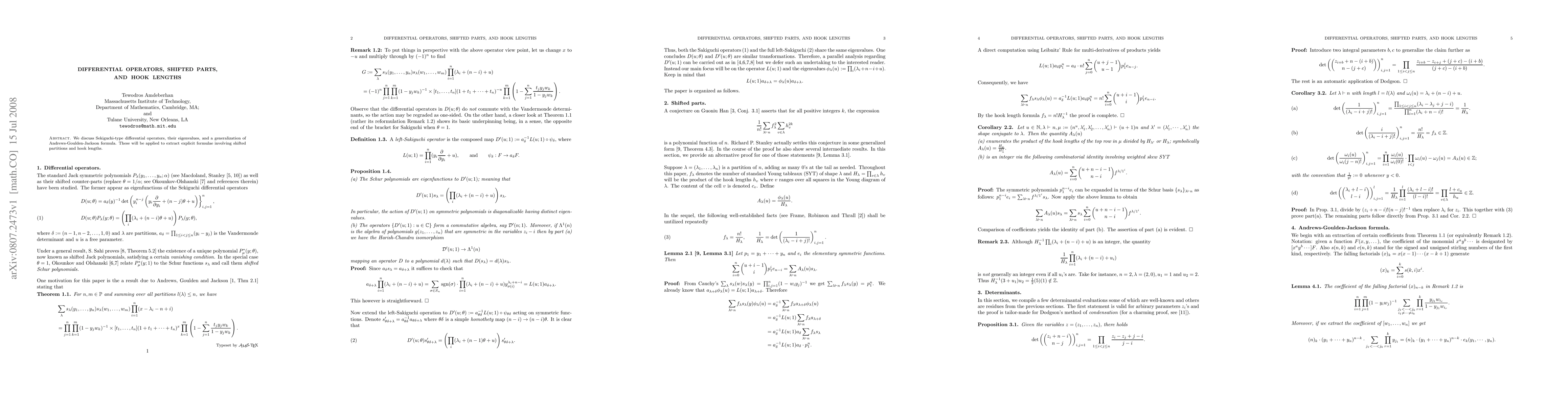 We discuss Sekiguchi-type differential operators, their eigenvalues, and a generalization of Andrews-Goulden-Jackson formula. These will be applied to extract explicit formulae involving shifted partitions and hook lengths.