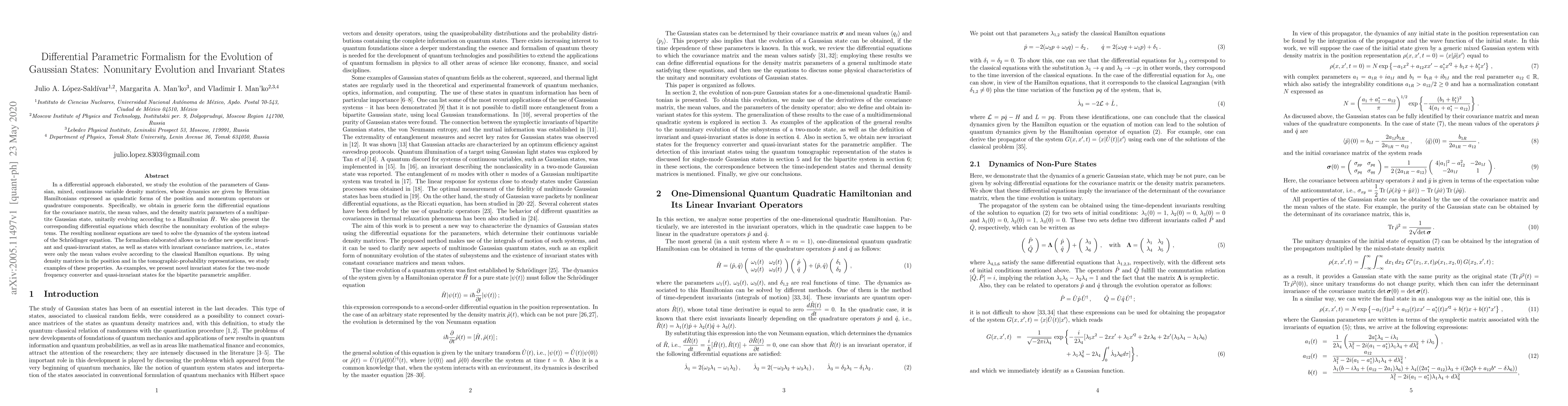 This paper develops a differential parametric formalism for the evolution of Gaussian states, deriving equations for the covariance matrix and mean values under both unitary and nonunitary dynamics. It identifies new invariant and quasi-invariant states, exemplified by the two-mode frequency converter and the bipartite parametric amplifier.