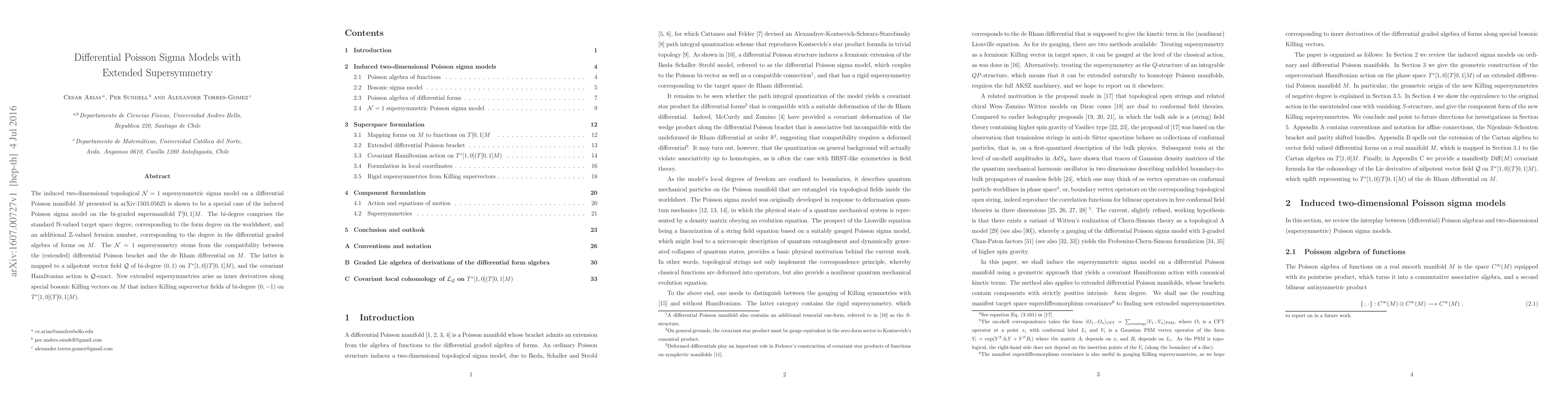 The induced two-dimensional topological N=1 supersymmetric sigma model on a differential Poisson manifold M presented in arXiv:1503.05625 is shown to be a special case of the induced Poisson sigma model on the bi-graded supermanifold T[0,1]M. The bi-degree comprises the standard N-valued target space degree, corresponding to the form degree on the worldsheet, and an additional Z-valued fermion number, corresponding to the degree in the differential graded algebra of forms on M. The N=1 supersymmetry stems from the compatibility between the (extended) differential Poisson bracket and the de Rham differential on M. The latter is mapped to a nilpotent vector field Q of bi-degree (0,1) on T*[1,0](T[0,1]M), and the covariant Hamiltonian action is Q-exact. New extended supersymmetries arise as inner derivatives along special bosonic Killing vectors on M that induce Killing supervector fields of bi-degree (0,-1) on T*[1,0](T[0,1]M).