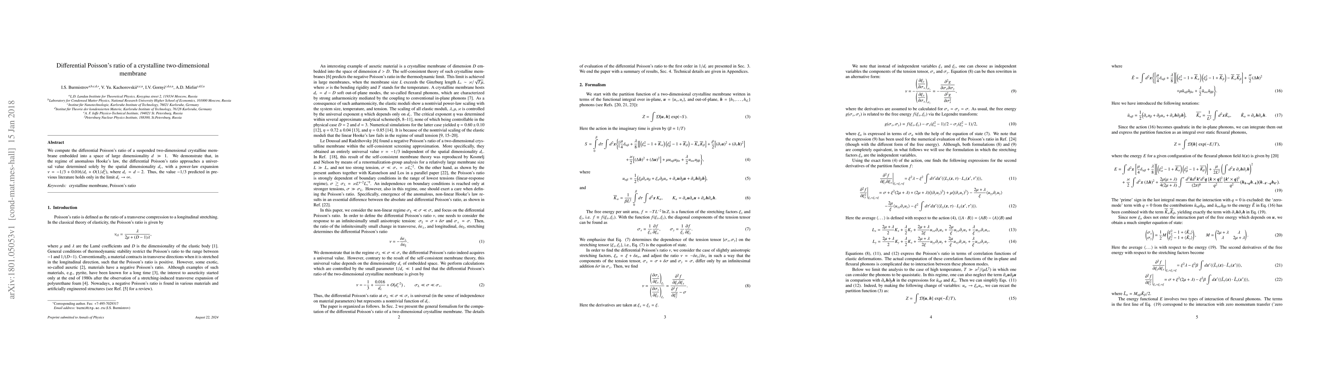 We compute the differential Poisson's ratio of a suspended two-dimensional crystalline membrane embedded into a space of large dimensionality $d \gg 1$. We demonstrate that, in the regime of anomalous Hooke's law, the differential Poisson's ratio approaches a universal value determined solely by the spatial dimensionality $d_c$, with a power-law expansion $\nu = -1/3 + 0.016/d_c + O(1/d_c^2)$, where $d_c=d-2$. Thus, the value $-1/3$ predicted in previous literature holds only in the limit $d_c\to \infty$.