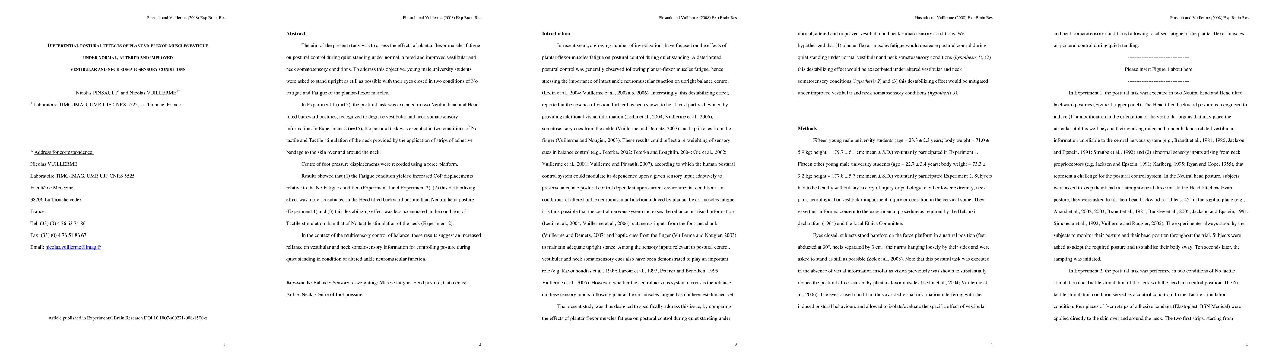 The aim of the present study was to assess the effects of plantar-flexor muscles fatigue on postural control during quiet standing under normal, altered and improved vestibular and neck somatosensory conditions. To address this objective, young male university students were asked to stand upright as still as possible with their eyes closed in two conditions of No Fatigue and Fatigue of the plantar-flexor muscles. In Experiment 1 (n=15), the postural task was executed in two Neutral head and Head tilted backward postures, recognized to degrade vestibular and neck somatosensory information. In Experiment 2 (n=15), the postural task was executed in two conditions of No tactile and Tactile stimulation of the neck provided by the application of strips of adhesive bandage to the skin over and around the neck. Centre of foot pressure displacements were recorded using a force platform. Results showed that (1) the Fatigue condition yielded increased CoP displacements relative to the No Fatigue condition (Experiment 1 and Experiment 2), (2) this destabilizing effect was more accentuated in the Head tilted backward posture than Neutral head posture (Experiment 1) and (3) this destabilizing effect was less accentuated in the condition of Tactile stimulation than that of No tactile stimulation of the neck (Experiment 2). In the context of the multisensory control of balance, these results suggest an increased reliance on vestibular and neck somatosensory information for controlling posture during quiet standing in condition of altered ankle neuromuscular function.