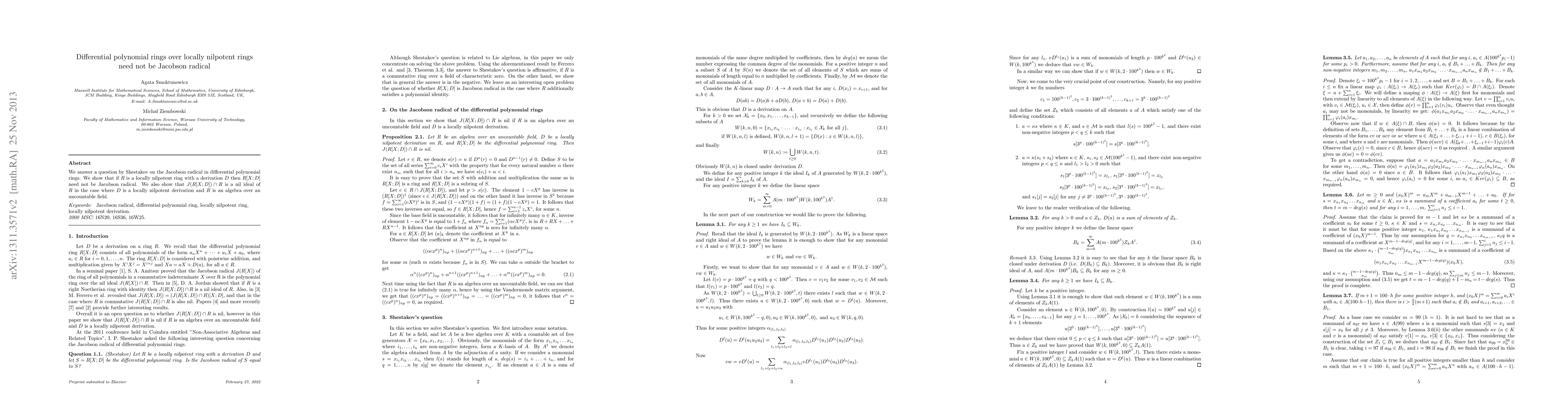 This research demonstrates that differential polynomial rings over locally nilpotent rings with a derivation do not necessarily have a Jacobson radical, answering Shestakov's question. It further establishes that when R is a locally nilpotent ring, J(R[X;D])∩R is a nil ideal of R when R is an algebra over an uncountable field.