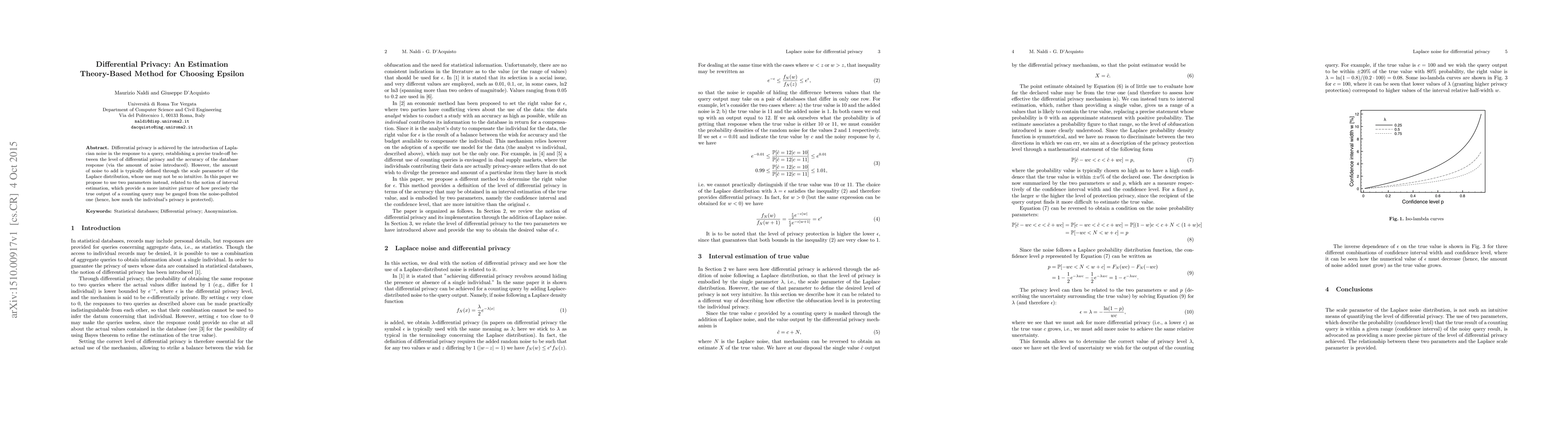 Differential privacy is achieved by the introduction of Laplacian noise in the response to a query, establishing a precise trade-off between the level of differential privacy and the accuracy of the database response (via the amount of noise introduced). However, the amount of noise to add is typically defined through the scale parameter of the Laplace distribution, whose use may not be so intuitive. In this paper we propose to use two parameters instead, related to the notion of interval estimation, which provide a more intuitive picture of how precisely the true output of a counting query may be gauged from the noise-polluted one (hence, how much the individual's privacy is protected).