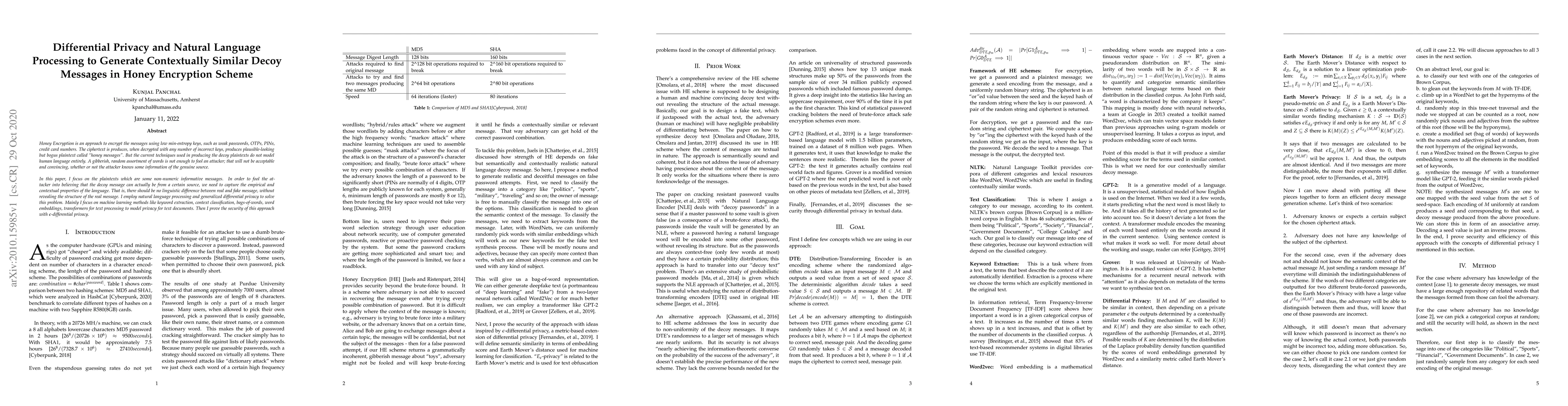 Honey Encryption is an approach to encrypt the messages using low min-entropy keys, such as weak passwords, OTPs, PINs, credit card numbers. The ciphertext is produces, when decrypted with any number of incorrect keys, produces plausible-looking but bogus plaintext called "honey messages". But the current techniques used in producing the decoy plaintexts do not model human language entirely. A gibberish, random assortment of words is not enough to fool an attacker; that will not be acceptable and convincing, whether or not the attacker knows some information of the genuine source. In this paper, I focus on the plaintexts which are some non-numeric informative messages. In order to fool the attacker into believing that the decoy message can actually be from a certain source, we need to capture the empirical and contextual properties of the language. That is, there should be no linguistic difference between real and fake message, without revealing the structure of the real message. I employ natural language processing and generalized differential privacy to solve this problem. Mainly I focus on machine learning methods like keyword extraction, context classification, bags-of-words, word embeddings, transformers for text processing to model privacy for text documents. Then I prove the security of this approach with e-differential privacy.