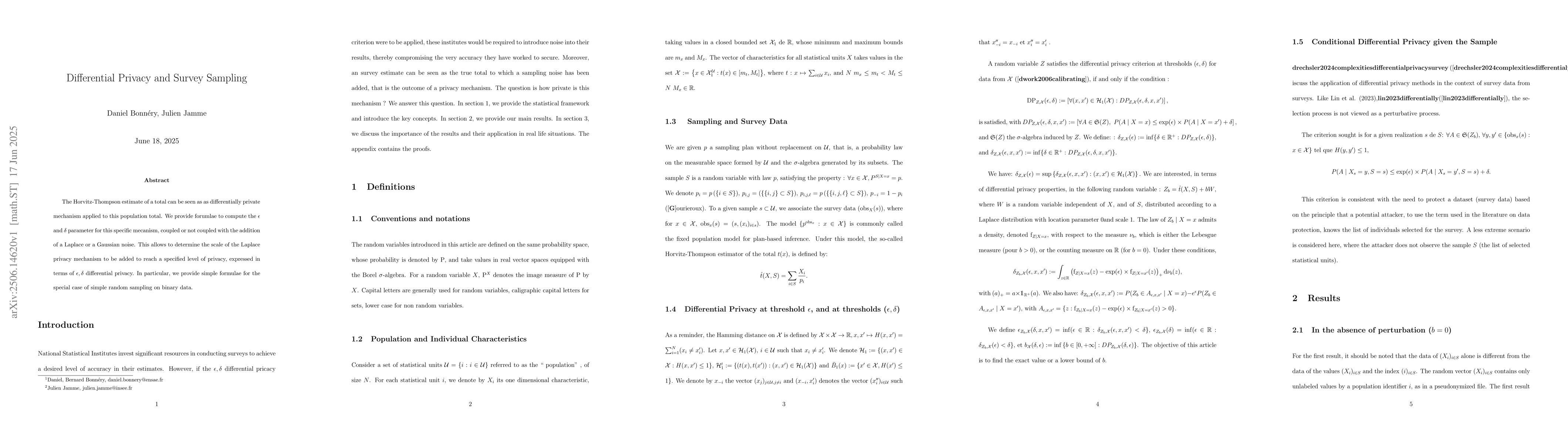 The Horvitz-Thompson estimate of a total can be seen as as differentially private mechanism applied to this population total. We provide forumlae to compute the $\epsilon$ and $\delta$ parameter for this specific mecanism, coupled or not coupled with the addition of a Laplace or a Gaussian noise. This allows to determine the scale of the Laplace privacy mechanism to be added to reach a specified level of privacy, expressed in terms of $\epsilon,\delta$ differential privacy. In particular, we provide simple formulae for the special case of simple random sampling on binary data.