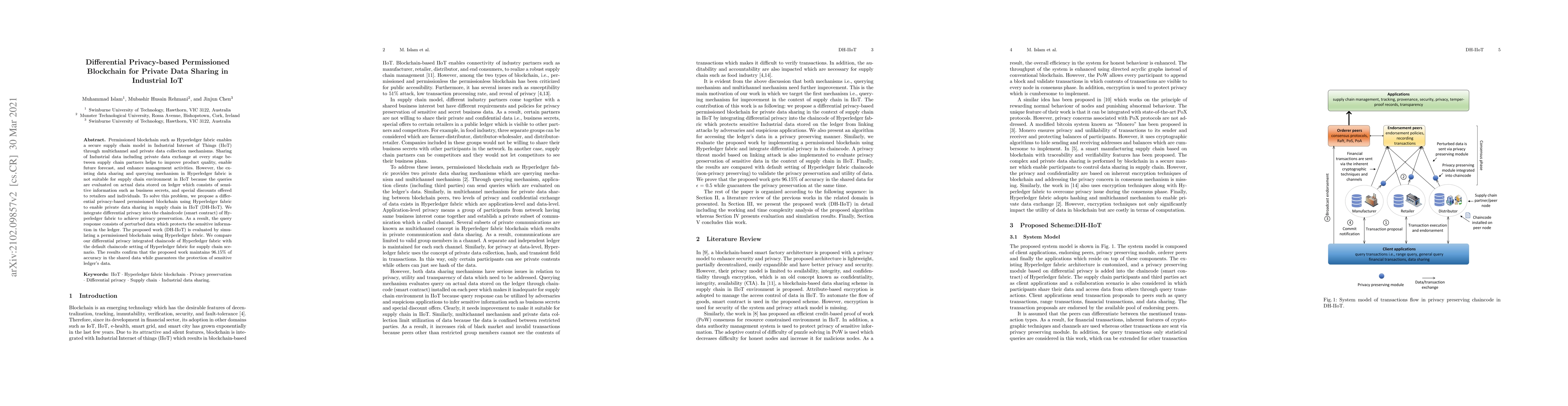 This paper proposes a differential privacy-based permissioned blockchain using Hyperledger fabric for private data sharing in Industrial IoT supply chains. The integration of differential privacy in the chaincode ensures the protection of sensitive information while maintaining 96.15% accuracy in shared data.