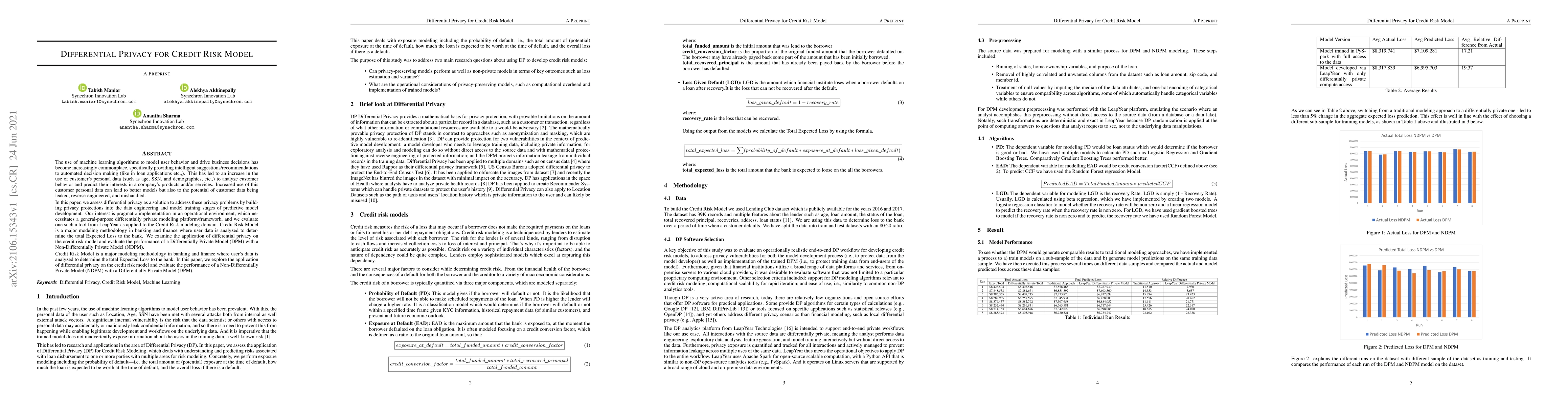 The use of machine learning algorithms to model user behavior and drive business decisions has become increasingly commonplace, specifically providing intelligent recommendations to automated decision making. This has led to an increase in the use of customers personal data to analyze customer behavior and predict their interests in a companys products. Increased use of this customer personal data can lead to better models but also to the potential of customer data being leaked, reverse engineered, and mishandled. In this paper, we assess differential privacy as a solution to address these privacy problems by building privacy protections into the data engineering and model training stages of predictive model development. Our interest is a pragmatic implementation in an operational environment, which necessitates a general purpose differentially private modeling framework, and we evaluate one such tool from LeapYear as applied to the Credit Risk modeling domain. Credit Risk Model is a major modeling methodology in banking and finance where user data is analyzed to determine the total Expected Loss to the bank. We examine the application of differential privacy on the credit risk model and evaluate the performance of a Differentially Private Model with a Non Differentially Private Model. Credit Risk Model is a major modeling methodology in banking and finance where users data is analyzed to determine the total Expected Loss to the bank. In this paper, we explore the application of differential privacy on the credit risk model and evaluate the performance of a Non Differentially Private Model with Differentially Private Model.