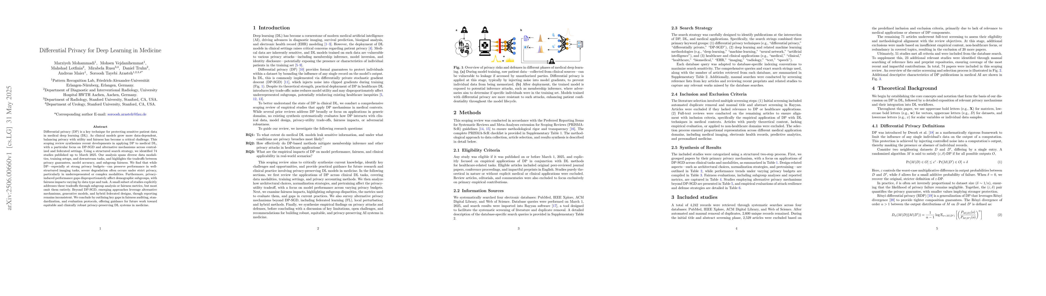 A scoping review analyzes 74 studies on applying differential privacy to medical deep learning, highlighting tradeoffs between privacy guarantees and model accuracy, particularly for underrepresented groups.