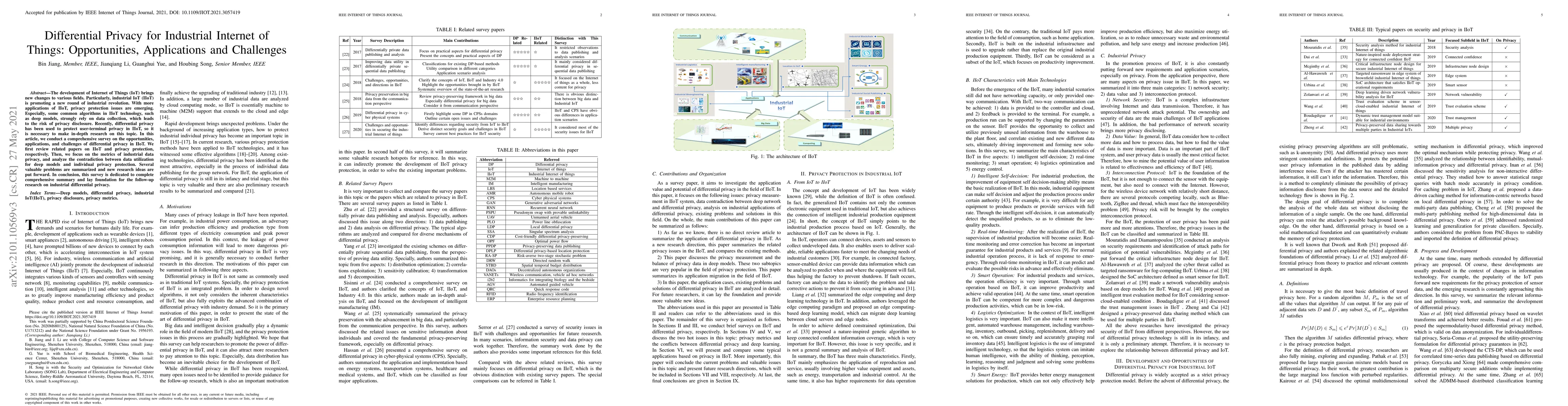 The development of Internet of Things (IoT) brings new changes to various fields. Particularly, industrial Internet of Things (IIoT) is promoting a new round of industrial revolution. With more applications of IIoT, privacy protection issues are emerging. Specially, some common algorithms in IIoT technology such as deep models strongly rely on data collection, which leads to the risk of privacy disclosure. Recently, differential privacy has been used to protect user-terminal privacy in IIoT, so it is necessary to make in-depth research on this topic. In this paper, we conduct a comprehensive survey on the opportunities, applications and challenges of differential privacy in IIoT. We firstly review related papers on IIoT and privacy protection, respectively. Then we focus on the metrics of industrial data privacy, and analyze the contradiction between data utilization for deep models and individual privacy protection. Several valuable problems are summarized and new research ideas are put forward. In conclusion, this survey is dedicated to complete comprehensive summary and lay foundation for the follow-up researches on industrial differential privacy.